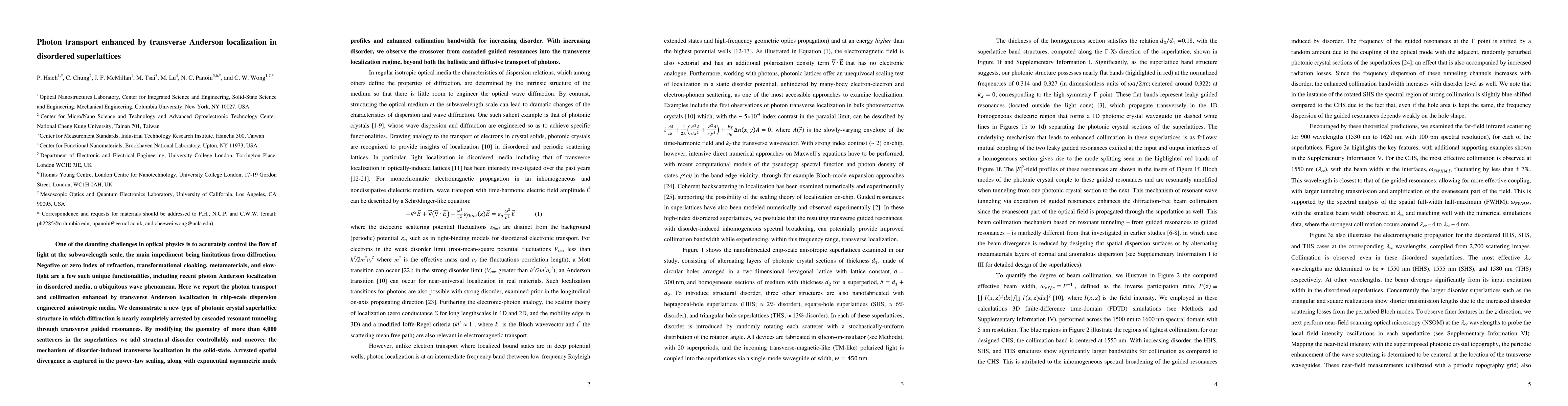This paper explores photon transport enhancement via transverse Anderson localization in disordered superlattices, demonstrating that controlled disorder can arrest diffraction and achieve near-complete localization of light, leading to improved collimation and bandwidth. The study reveals a shift from guided resonances to transverse localization with increasing disorder, providing a novel method for subwavelength light control.