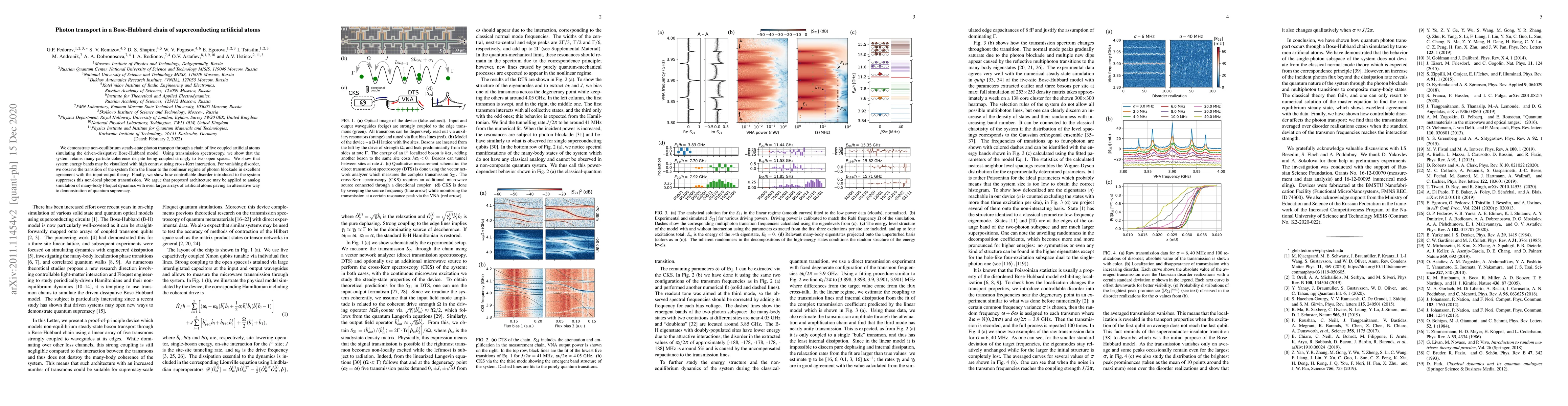This paper demonstrates non-equilibrium photon transport in a Bose-Hubbard chain of superconducting artificial atoms, showing many-particle coherence and visualizing energy bands via cross-Kerr interaction. It also reveals the transition from linear to nonlinear photon blockade regimes and the suppression of non-local photon transmission through controllable disorder.