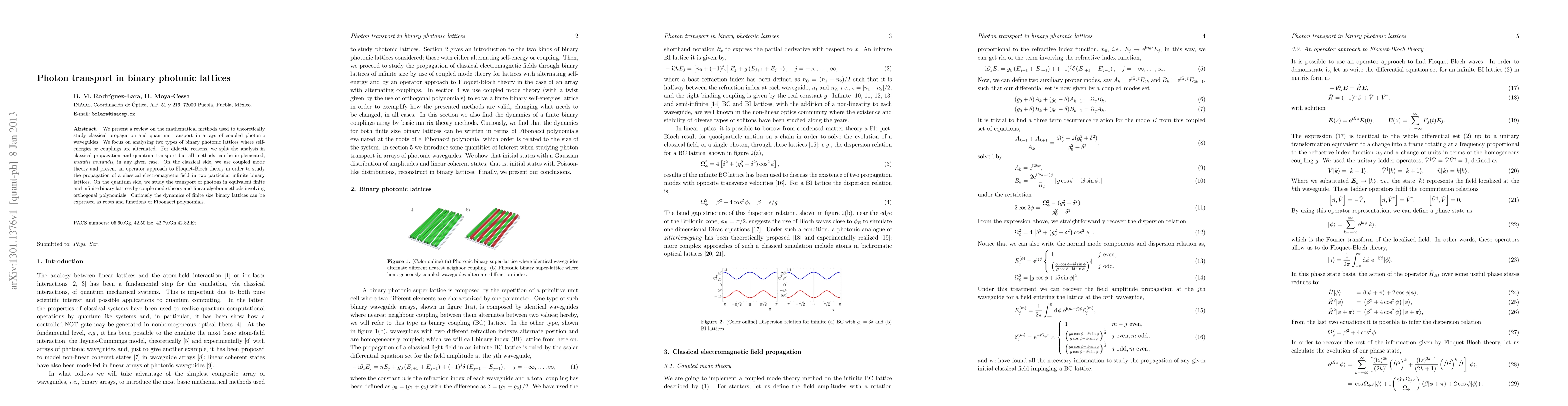 We present a review on the mathematical methods used to theoretically study classical propagation and quantum transport in arrays of coupled photonic waveguides. We focus on analysing two types of binary photonic lattices where self-energies or couplings are alternated. For didactic reasons, we split the analysis in classical propagation and quantum transport but all methods can be implemented, mutatis mutandis, in any given case. On the classical side, we use coupled mode theory and present an operator approach to Floquet-Bloch theory in order to study the propagation of a classical electromagnetic field in two particular infinite binary lattices. On the quantum side, we study the transport of photons in equivalent finite and infinite binary lattices by couple mode theory and linear algebra methods involving orthogonal polynomials. Curiously the dynamics of finite size binary lattices can be expressed as roots and functions of Fibonacci polynomials.