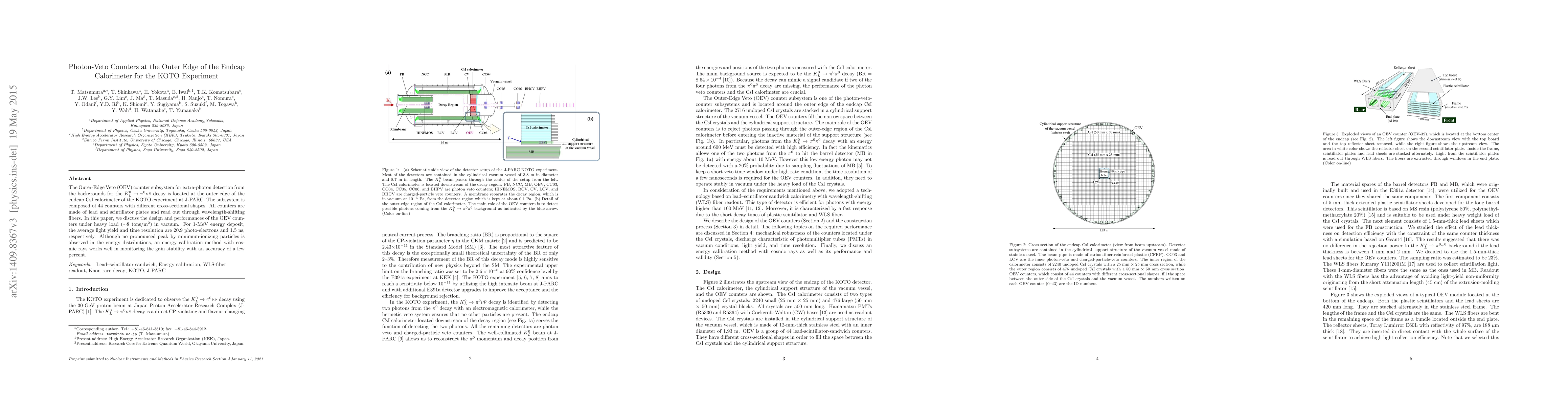 The KOTO experiment's Outer-Edge Veto (OEV) counter subsystem, located at the endcap CsI calorimeter, comprises 44 lead and scintillator plate counters to detect extra photons from backgrounds. The design and performance under heavy load show an average light yield of 20.9 photo-electrons and a time resolution of 1.5 ns for 1-MeV energy deposits, with effective energy calibration using cosmic rays.