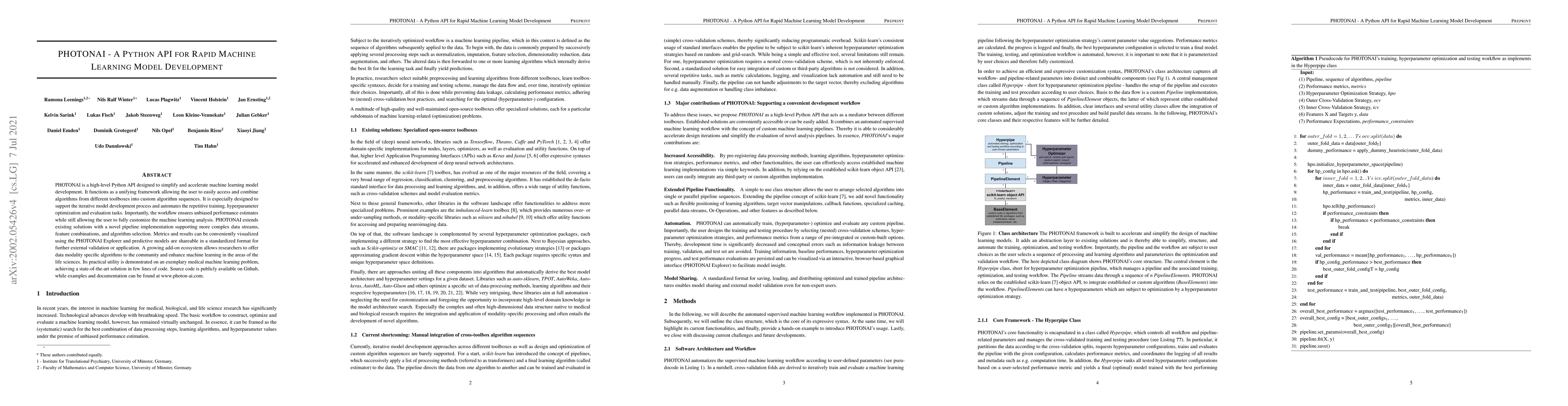 PHOTONAI is a high-level Python API designed to simplify and accelerate machine learning model development. It functions as a unifying framework allowing the user to easily access and combine algorithms from different toolboxes into custom algorithm sequences. It is especially designed to support the iterative model development process and automates the repetitive training, hyperparameter optimization and evaluation tasks. Importantly, the workflow ensures unbiased performance estimates while still allowing the user to fully customize the machine learning analysis. PHOTONAI extends existing solutions with a novel pipeline implementation supporting more complex data streams, feature combinations, and algorithm selection. Metrics and results can be conveniently visualized using the PHOTONAI Explorer and predictive models are shareable in a standardized format for further external validation or application. A growing add-on ecosystem allows researchers to offer data modality specific algorithms to the community and enhance machine learning in the areas of the life sciences. Its practical utility is demonstrated on an exemplary medical machine learning problem, achieving a state-of-the-art solution in few lines of code. Source code is publicly available on Github, while examples and documentation can be found at www.photon-ai.com.