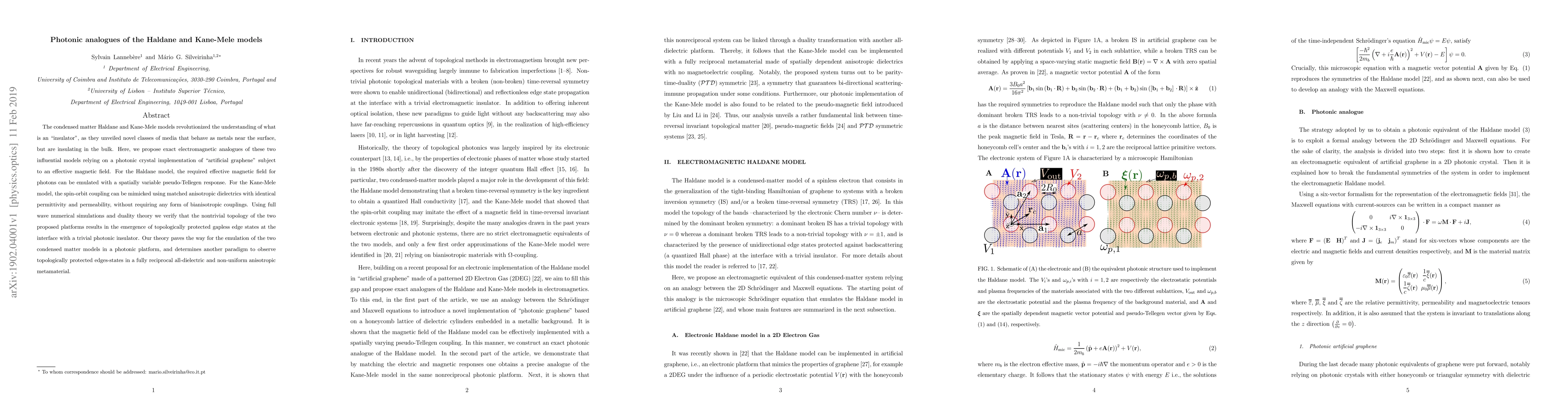 The condensed matter Haldane and Kane-Mele models revolutionized the understanding of what is an "insulator", as they unveiled novel classes of media that behave as metals near the surface, but are insulating in the bulk. Here, we propose exact electromagnetic analogues of these two influential models relying on a photonic crystal implementation of "artificial graphene" subject to an effective magnetic field. For the Haldane model, the required effective magnetic field for photons can be emulated with a spatially variable pseudo-Tellegen response. For the Kane-Mele model, the spin-orbit coupling can be mimicked using matched anisotropic dielectrics with identical permittivity and permeability, without requiring any form of bianisotropic couplings. Using full wave numerical simulations and duality theory we verify that the nontrivial topology of the two proposed platforms results in the emergence of topologically protected gapless edge states at the interface with a trivial photonic insulator. Our theory paves the way for the emulation of the two condensed matter models in a photonic platform, and determines another paradigm to observe topologically protected edges-states in a fully reciprocal all-dielectric and non-uniform anisotropic metamaterial.