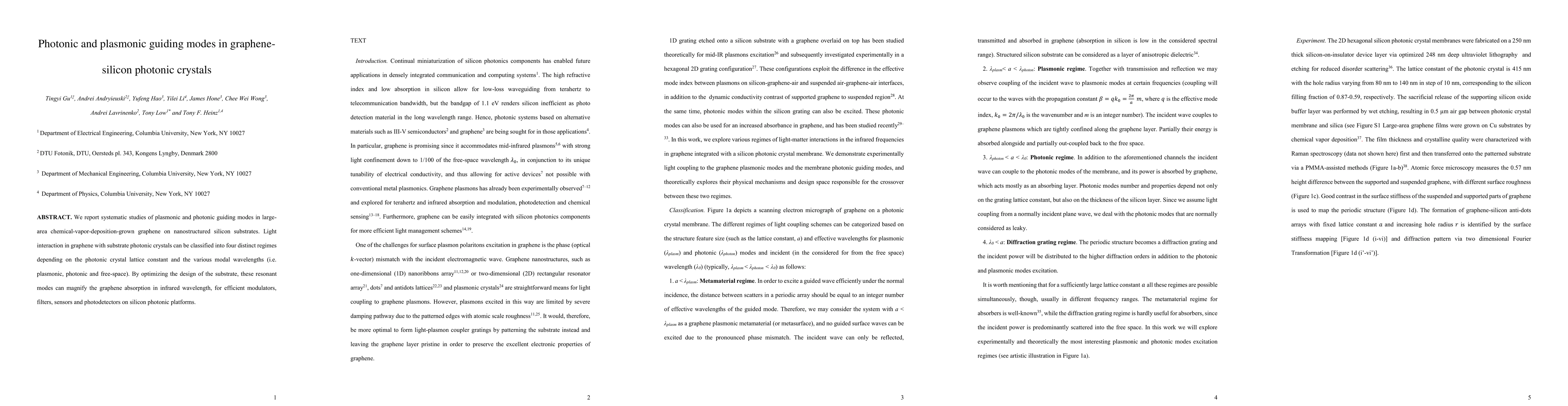 We report systematic studies of plasmonic and photonic guiding modes in large-area chemical-vapor-deposition-grown graphene on nanostructured silicon substrates. Light interaction in graphene with substrate photonic crystals can be classified into four distinct regimes depending on the photonic crystal lattice constant and the various modal wavelengths (i.e. plasmonic, photonic and free-space). By optimizing the design of the substrate, these resonant modes can magnify the graphene absorption in infrared wavelength, for efficient modulators, filters, sensors and photodetectors on silicon photonic platforms.