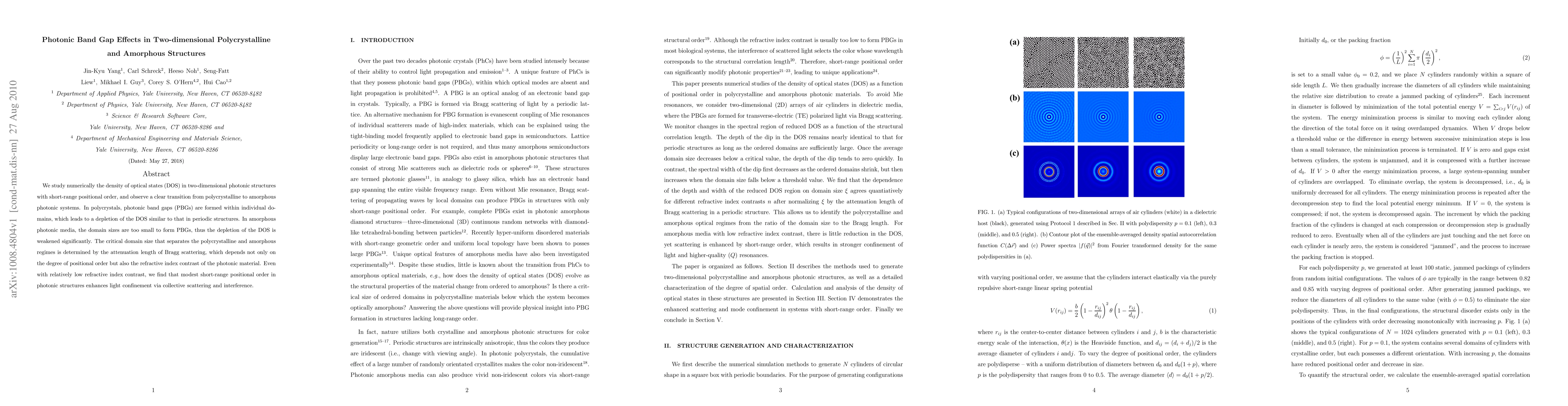 This paper numerically investigates the density of optical states in two-dimensional photonic structures transitioning from polycrystalline to amorphous forms, revealing that PBGs form in polycrystalline domains but are absent in amorphous media due to small domain sizes. The study finds that short-range positional order enhances light confinement despite low refractive index contrast.