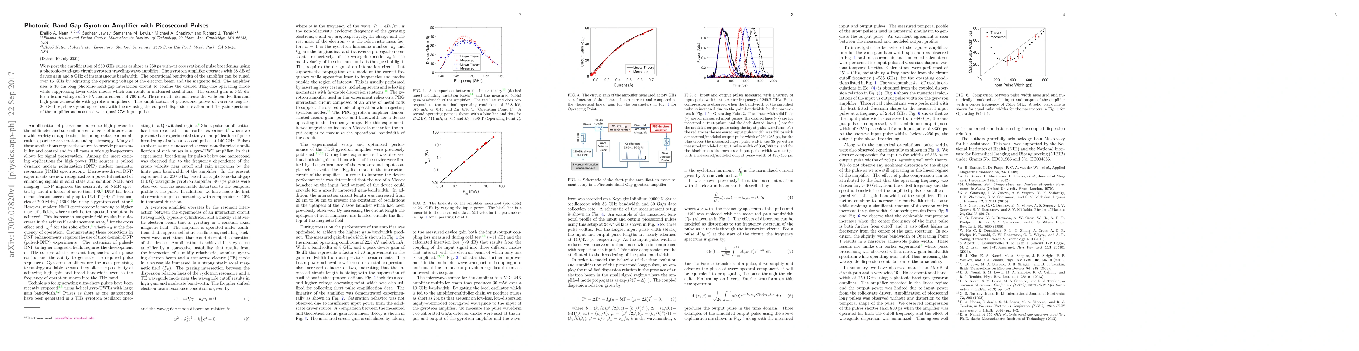 The research utilized a photonic-band-gap (PBG) gyrotron traveling-wave amplifier to amplify 250 GHz picosecond pulses without pulse broadening, achieving 38 dB of device gain and 8 GHz of instantaneous bandwidth.