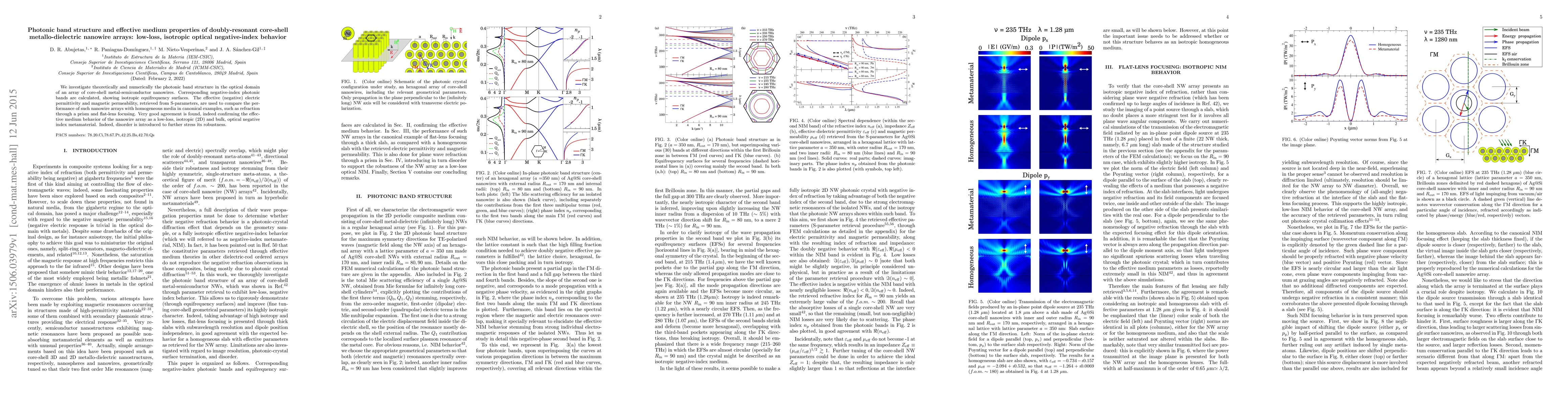 This paper explores the photonic band structure of core-shell metallo-dielectric nanowire arrays, demonstrating low-loss, isotropic optical negative-index behavior. The effective medium properties confirm the nanowire arrays' performance akin to homogeneous media, validated through refraction and focusing examples, and shown to be robust even with disorder.