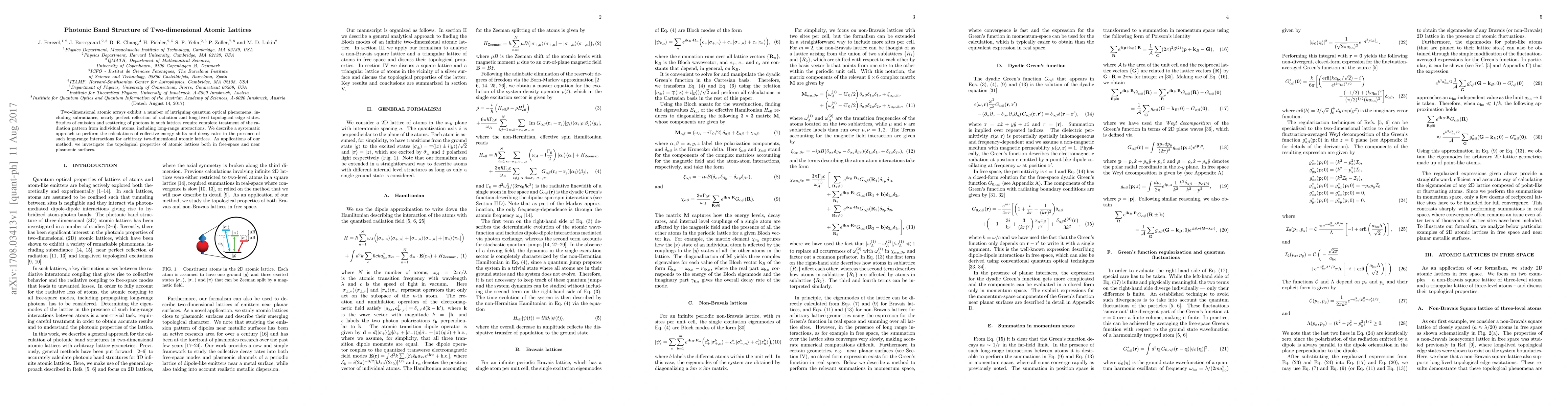 Two-dimensional atomic arrays exhibit a number of intriguing quantum optical phenomena, including subradiance, nearly perfect reflection of radiation and long-lived topological edge states. Studies of emission and scattering of photons in such lattices require complete treatment of the radiation pattern from individual atoms, including long-range interactions. We describe a systematic approach to perform the calculations of collective energy shifts and decay rates in the presence of such long-range interactions for arbitrary two-dimensional atomic lattices. As applications of our method, we investigate the topological properties of atomic lattices both in free-space and near plasmonic surfaces.