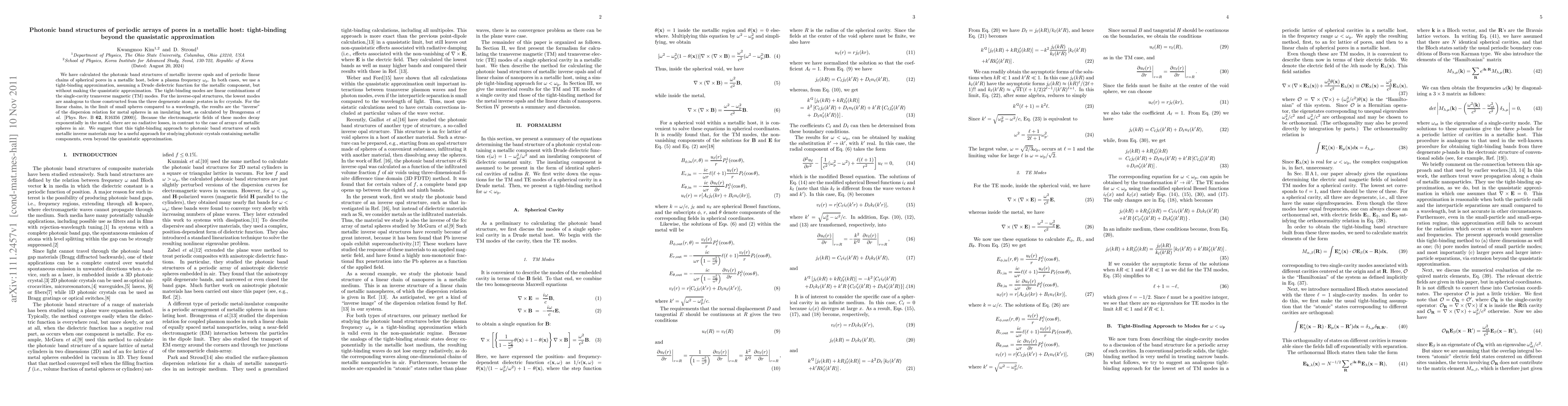 This paper investigates the photonic band structures of metallic inverse opals and linear chains of pores in a metallic host using a tight-binding approach without the quasistatic approximation. The results show no radiative losses due to the exponential decay of electromagnetic fields in the metal, suggesting a useful method for studying photonic crystals with metallic components.