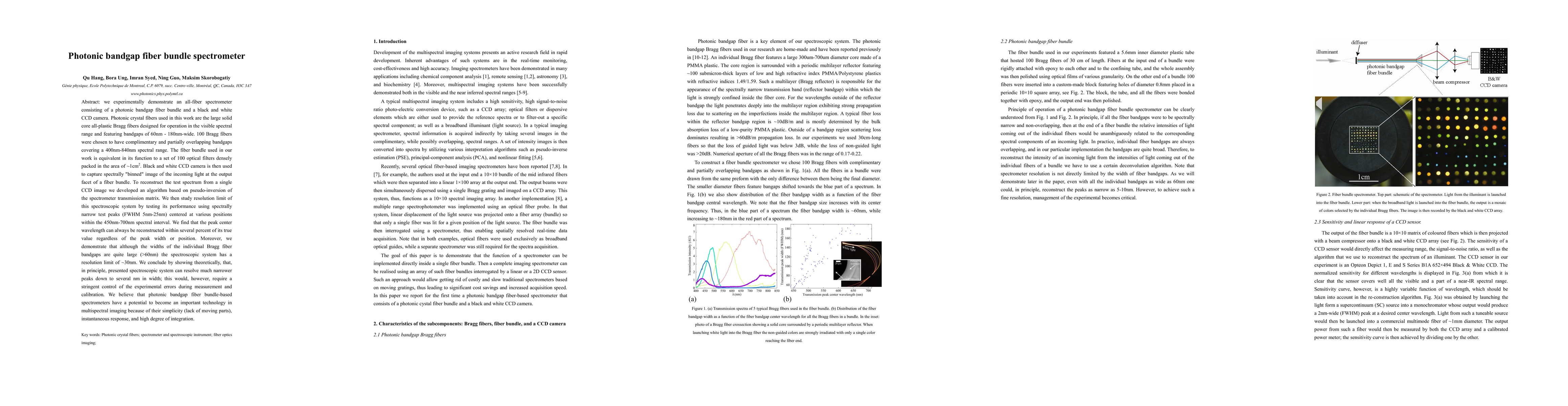 This paper presents an all-fiber spectrometer using a photonic bandgap fiber bundle and a CCD camera, demonstrating effective spectral resolution across a 400nm-840nm range. The system shows high precision in reconstructing peak wavelengths, indicating potential for multispectral imaging due to its simplicity and integration.