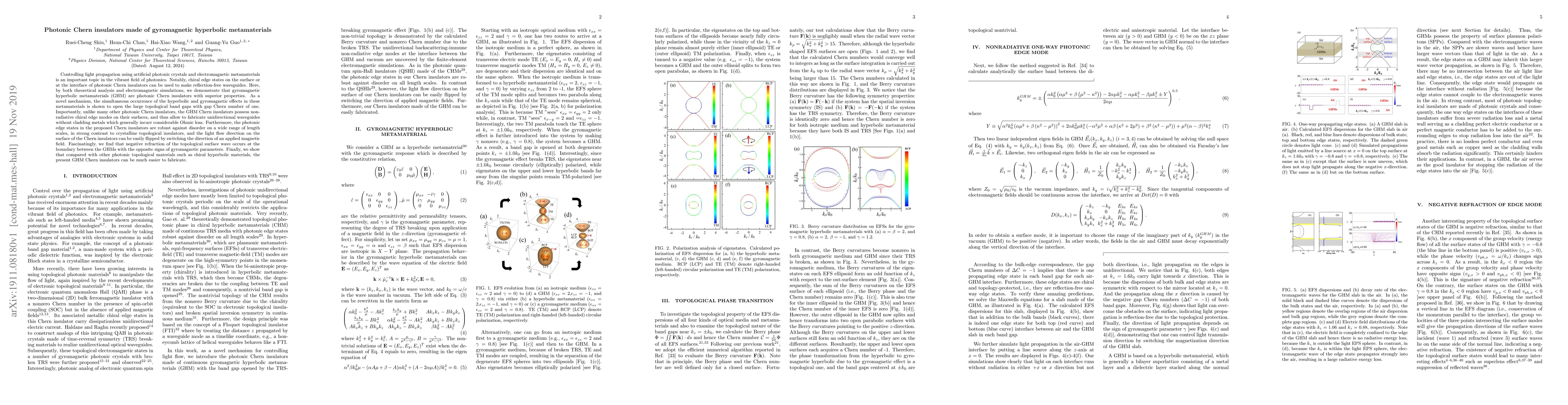 This paper demonstrates that gyromagnetic hyperbolic metamaterials (GHM) exhibit properties of photonic Chern insulators, enabling reflection-free waveguides with non-radiative chiral edge modes and superior robustness against disorder. The GHM Chern insulators allow for unidirectional waveguides without metal cladding, reducing Ohmic losses.
