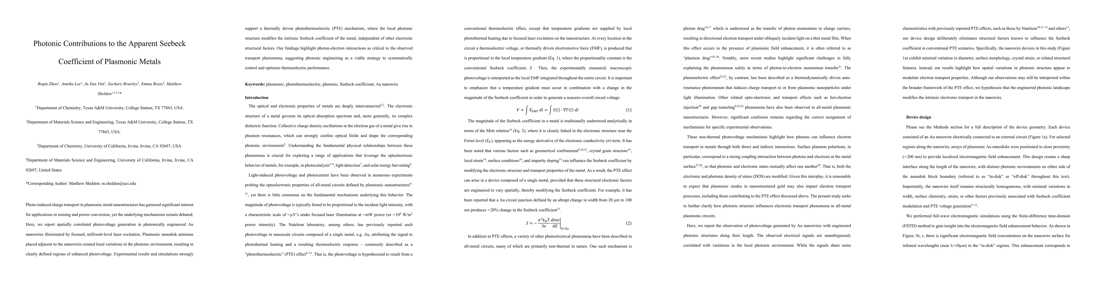 Photo-induced charge transport in plasmonic metal nanostructures has garnered significant interest for applications in sensing and power conversion, yet the underlying mechanisms remain debated. Here, we report spatially correlated photovoltage generation in photonically engineered Au nanowires illuminated by focused, milliwatt-level laser excitation. Plasmonic nanodisk antennas placed adjacent to the nanowires created local variations in the photonic environment, resulting in clearly defined regions of enhanced photovoltage. Experimental results and simulations strongly support a thermally driven photothermoelectric (PTE) mechanism, where the local photonic structure modifies the intrinsic Seebeck coefficient of the metal, independent of other electronic structural factors. Our findings highlight photon-electron interactions as critical to the observed transport phenomena, suggesting photonic engineering as a viable strategy to systematically control and optimize thermoelectric performance.