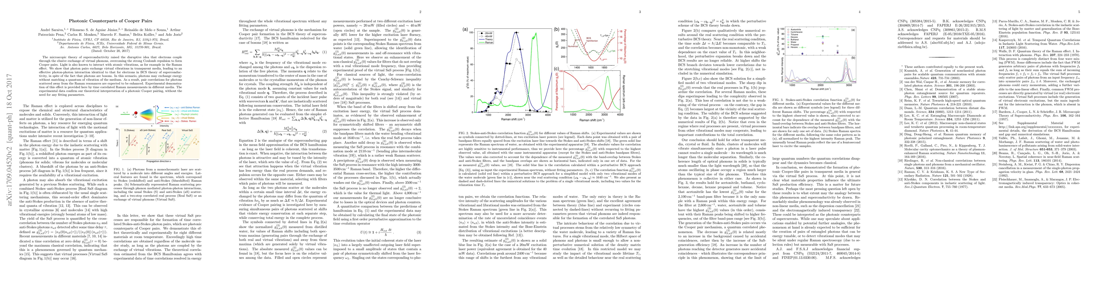 The microscopic theory of superconductivity raised the disruptive idea that electrons couple through the elusive exchange of virtual phonons, overcoming the strong Coulomb repulsion to form Cooper pairs. Light is also known to interact with atomic vibrations, as for example in the Raman effect. We show that photon pairs exchange virtual vibrations in transparent media, leading to an effective photon-photon interaction identical to that for electrons in BCS theory of supercondutivity, in spite of the fact that photons are bosons. In this scenario, photons may exchange energy without matching a quantum of vibration of the medium. As a result, pair correlations for photons scattered away from the Raman resonances are expected to be enhanced. Experimental demonstration of this effect is provided here by time correlated Raman measurements in different media. The experimental data confirm our theoretical interpretation of a photonic Cooper pairing, without the need for any fitting parameters.