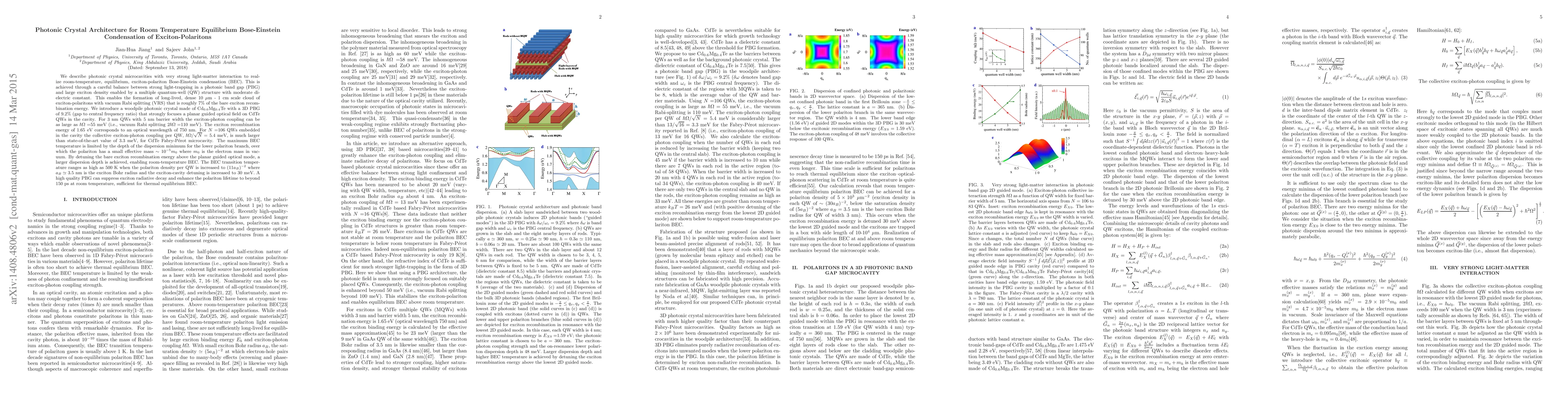 The paper introduces a photonic crystal architecture that enables room-temperature equilibrium BEC of exciton-polaritons through strong light-matter interaction in a carefully designed microcavity structure.