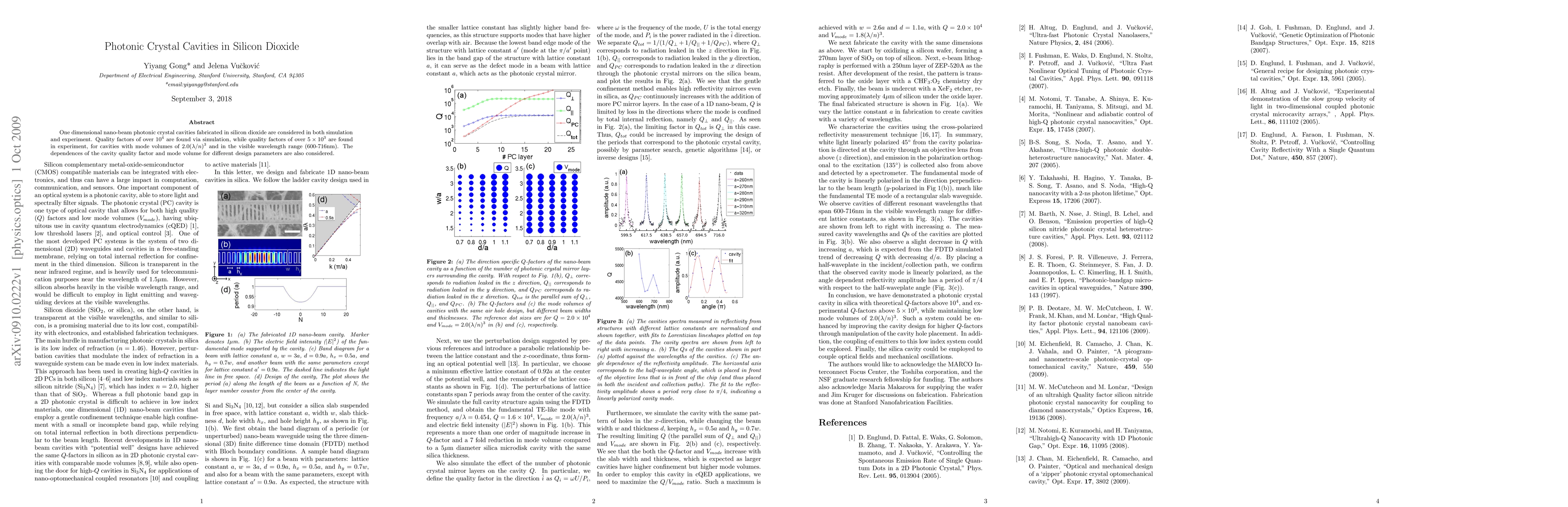 This paper investigates one-dimensional nano-beam photonic crystal cavities in silicon dioxide, achieving simulated quality factors over 10^4 and experimental quality factors over 5*10^3, with mode volumes of 2.0 cubic wavelengths in the visible range. The study also examines how cavity performance varies with design parameters.