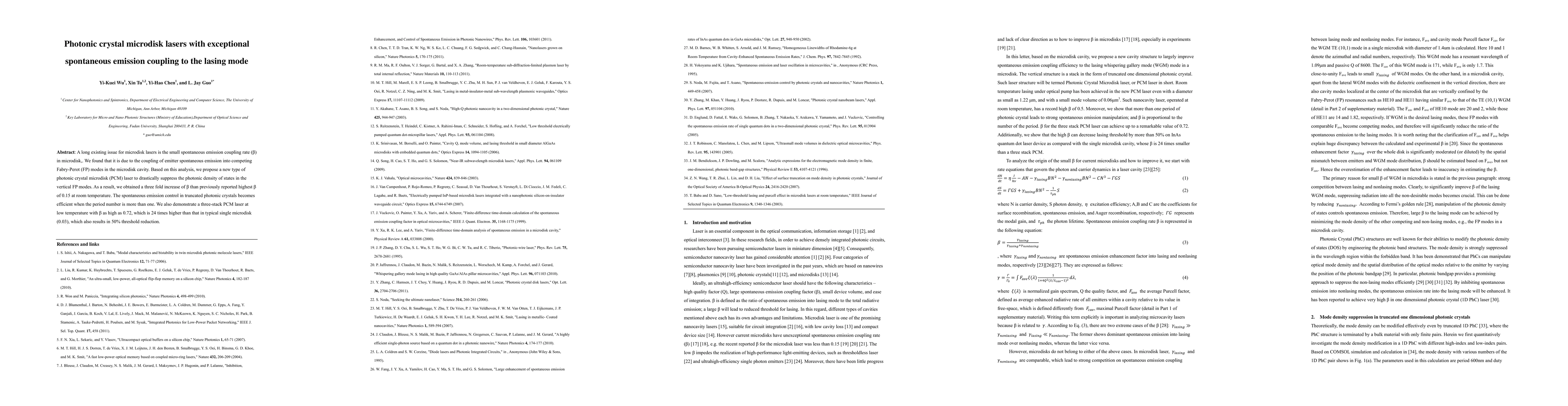 This paper proposes a photonic crystal microdisk laser design that significantly enhances the spontaneous emission coupling rate by suppressing competing Fabry-Perot modes, achieving a three-fold increase in coupling rate to 0.72 at low temperature, and reducing the lasing threshold by 50%.