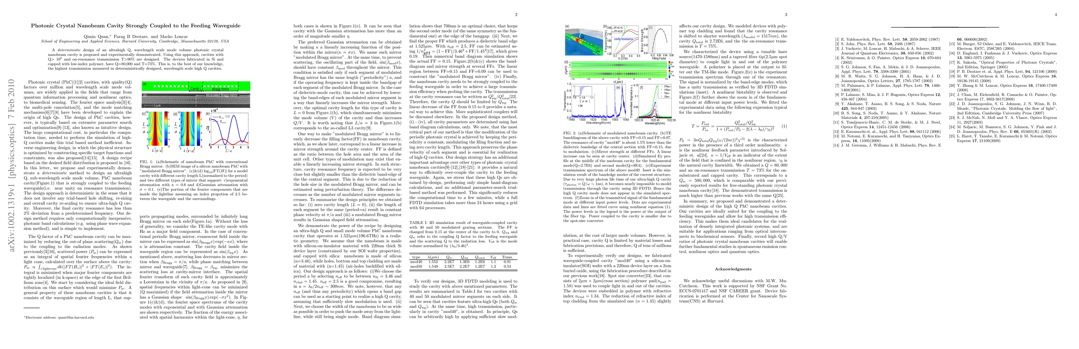 This paper proposes and demonstrates a photonic crystal nanobeam cavity with ultrahigh Q and small mode volume, achieving Q>10^6 and transmission T>90%. Fabricated in silicon and capped with low-index polymer, the devices show Q=80,000 and T=73%, marking the highest transmission in such cavities.