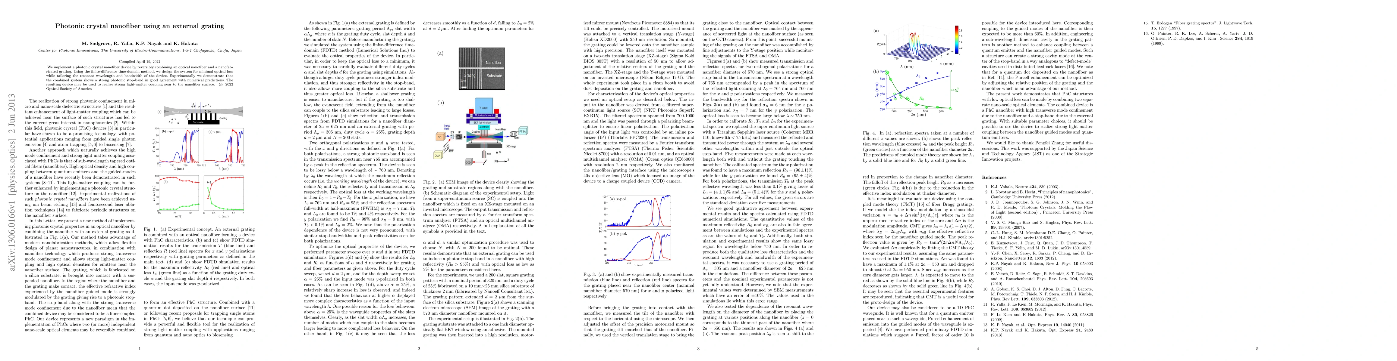 We implement a photonic crystal nanofiber device by reversibly combining an optical nanofiber and a nanofabricated grating. Using the finite-difference time-domain method, we design the system for minimal optical loss while tailoring the resonant wavelength and bandwidth of the device. Experimentally we demonstrate that the combined system shows a strong photonic stop-band in good agreement with numerical predictions. The resulting device may be used to realize strong light-matter coupling near to the nanofiber surface.