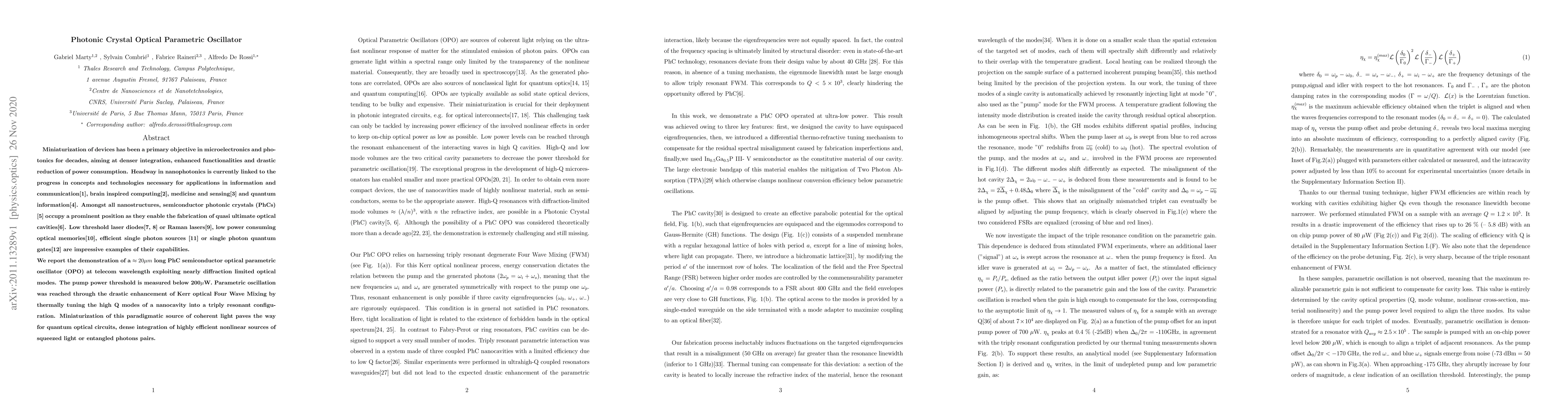 Miniaturization of devices has been a primary objective in microelectronics and photonics for decades, aiming at denser integration, enhanced functionalities and drastic reduction of power consumption. Headway in nanophotonics is currently linked to the progress in concepts and technologies necessary for applications in information and communication, brain inspired computing, medicine and sensing and quantum information. Amongst all nanostructures, semiconductor photonic crystals (PhCs) occupy a prominent position as they enable the fabrication of quasi ultimate optical cavities. Low threshold laser diodes or Raman lasers , low power consuming optical memories , efficient single photon sources or single photon quantum gates are impressive examples of their capabilities. We report the demonstration of about 20 micron long PhC semiconductor optical parametric oscillator (OPO) at telecom wavelength exploiting nearly diffraction limited optical modes. The pump power threshold is measured below 0.2 mW. Parametric oscillation was reached through the drastic enhancement of Kerr optical Four Wave Mixing by thermally tuning the high Q modes of a nanocavity into a triply resonant configuration. Miniaturization of this paradigmatic source of coherent light paves the way for quantum optical circuits, dense integration of highly efficient nonlinear sources of squeezed light or entangled photons pairs.