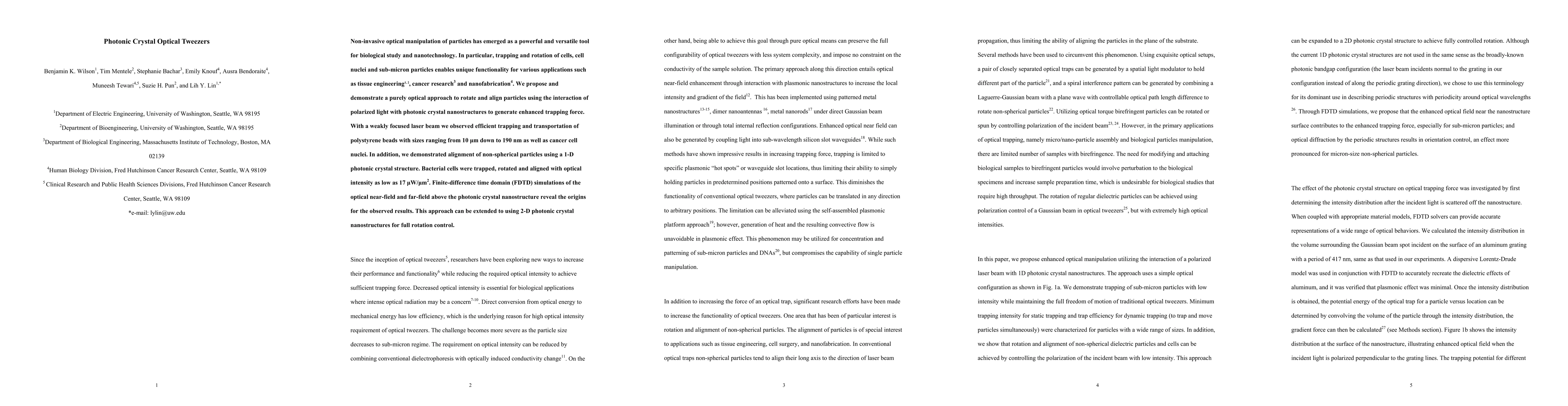 This paper proposes an optical method using photonic crystal nanostructures to manipulate and align particles via enhanced trapping forces from polarized light. Experiments show efficient trapping and rotation of particles down to 190 nm, including cancer cell nuclei, with minimal optical intensity, supported by FDTD simulations.