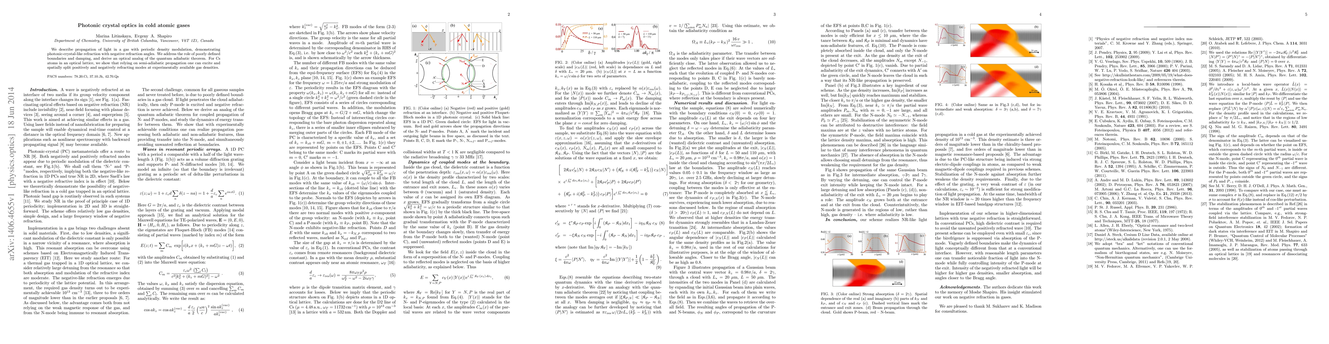This paper explores light propagation in cold atomic gases with periodic density modulation, demonstrating photonic-crystal-like refraction, including negative refraction angles. It also discusses the impact of boundary conditions and damping, and derives an optical analog of the quantum adiabatic theorem, showing how semi-adiabatic propagation can excite and spatially split refracting modes in Cs atoms.