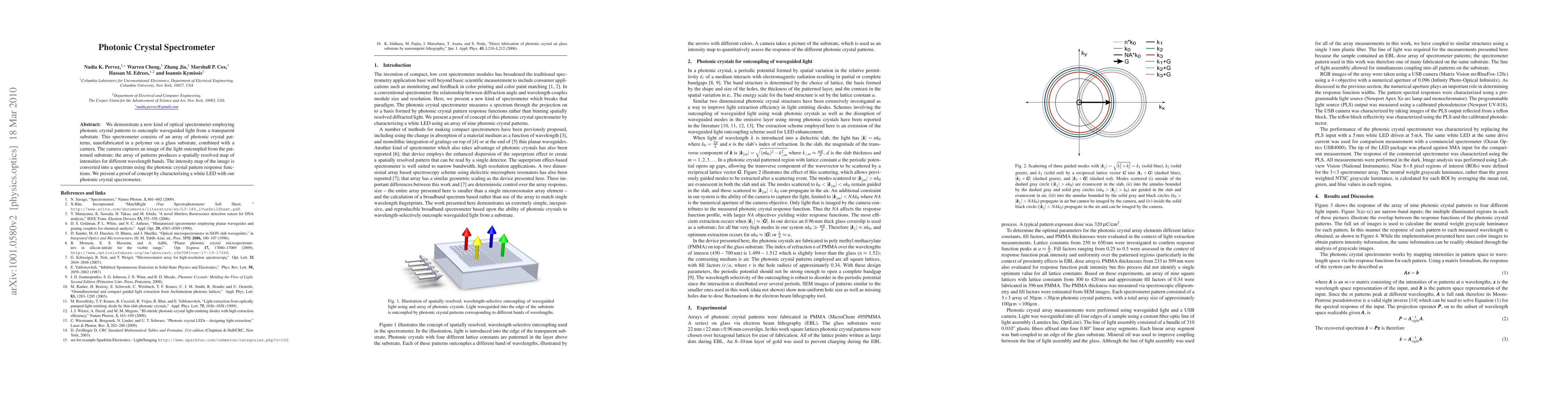 This paper introduces a photonic crystal spectrometer that uses photonic crystal patterns to outcouple and analyze light from a transparent substrate, converting the spatially resolved intensity map into a spectrum. The proof of concept demonstrates its effectiveness by characterizing a white LED.