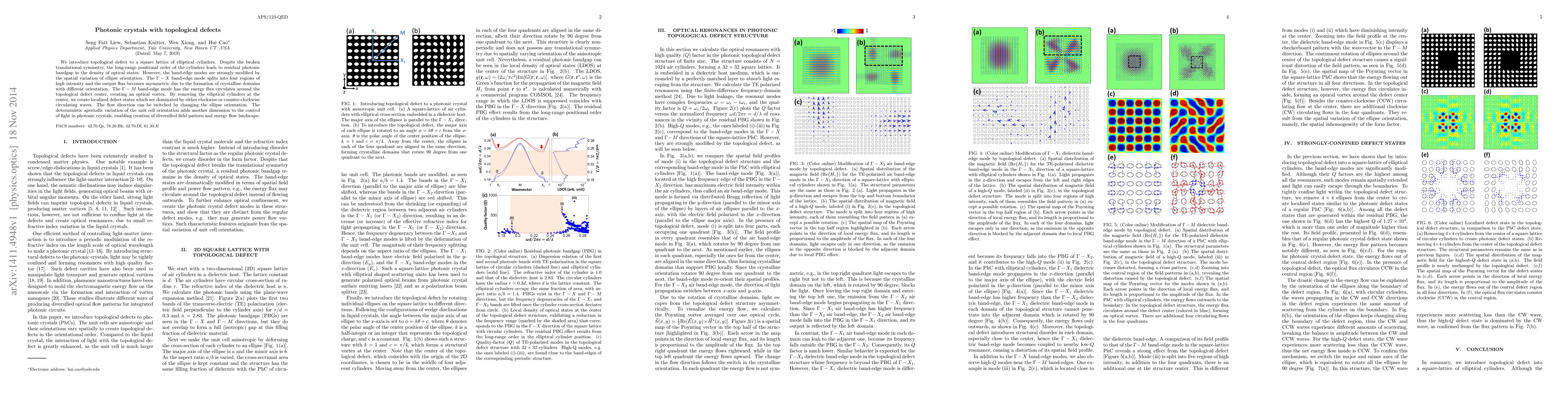 This research introduces topological defects into a square lattice of elliptical cylinders, creating residual photonic bandgaps with modified band-edge modes. The defects generate optical vortices and localized defect states, enabling control over light flow direction and field patterns in photonic crystals.