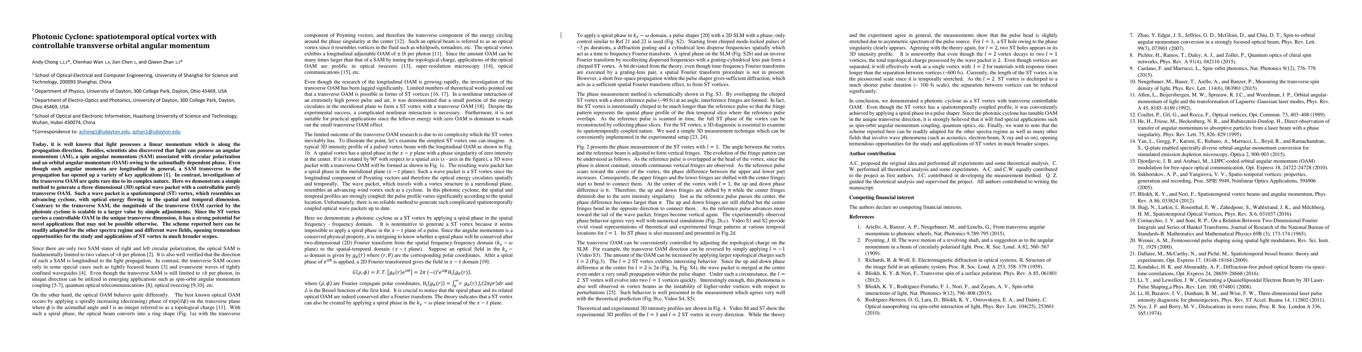 The research presents a method to generate a three-dimensional optical wave packet with controllable transverse orbital angular momentum (OAM), termed a photonic cyclone. This innovative spatiotemporal vortex has scalable transverse OAM, opening new possibilities for applications beyond conventional angular momentum phenomena.