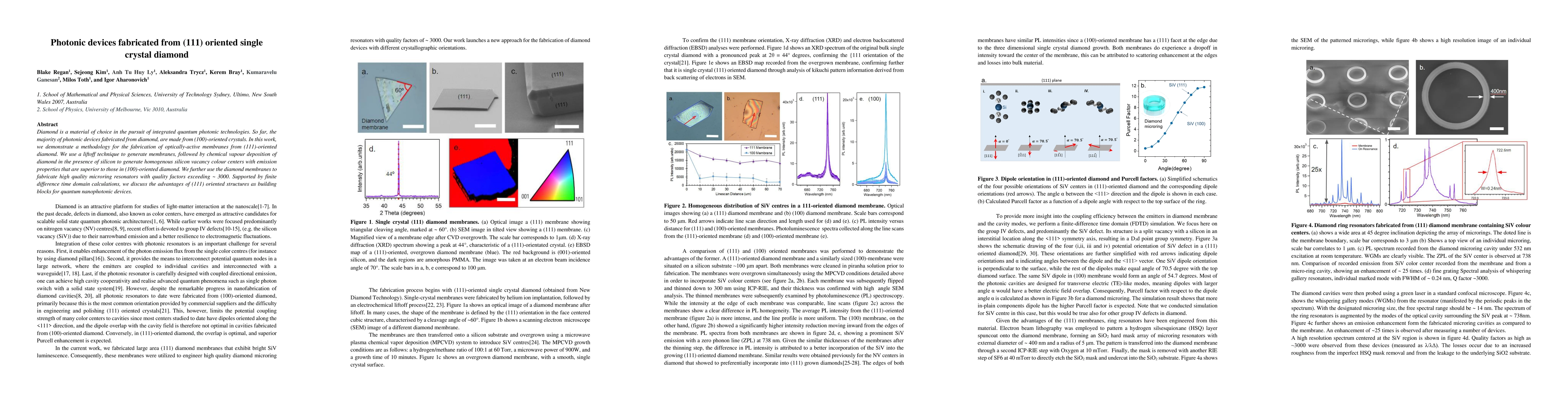 This paper presents a novel methodology for fabricating optically-active membranes from (111)-oriented single crystal diamond, utilizing liftoff and chemical vapour deposition techniques. The study highlights superior emission properties and high-quality microring resonators, suggesting (111)-oriented diamond as a promising material for quantum nanophotonic devices.