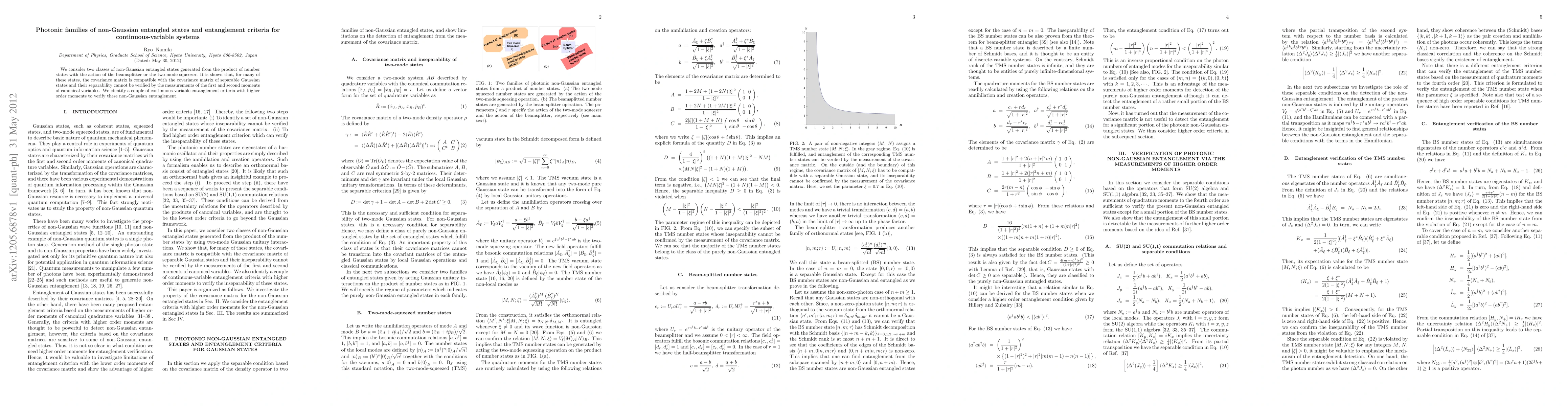 This paper explores non-Gaussian entangled states derived from number states via beamsplitters or two-mode squeezers, revealing that their covariance matrices resemble those of separable Gaussian states. It proposes new entanglement criteria based on higher order moments to distinguish these non-Gaussian entangled states.