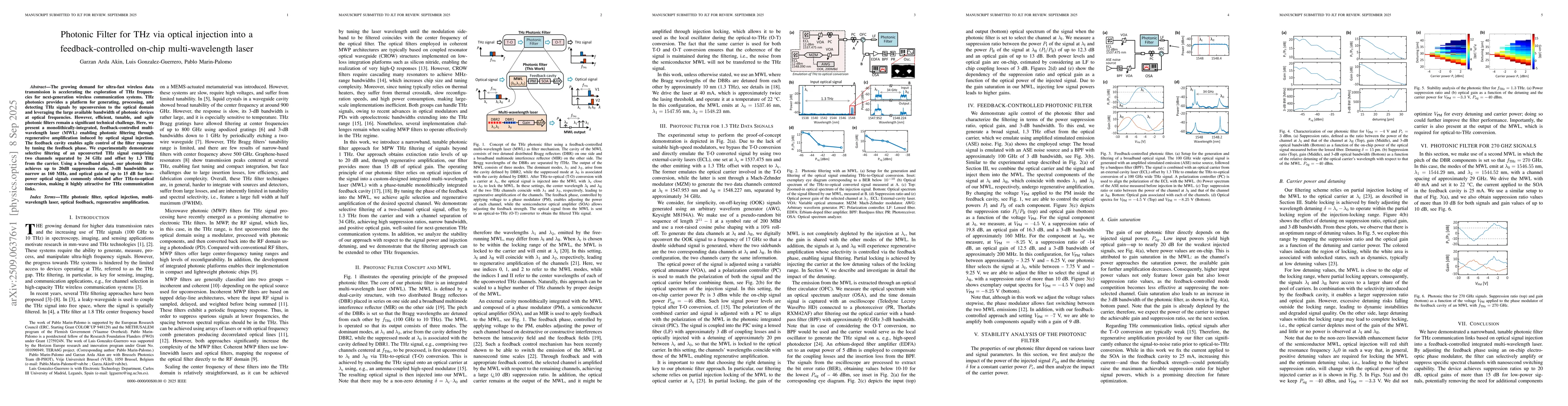 The growing demand for ultra-fast wireless data transmission is accelerating the exploration of THz frequencies for next-generation wireless communication systems. THz photonics provides a platform for generating, processing, and detecting THz signals by upconversion to the optical domain and leveraging the large available bandwidth of photonic devices at optical frequencies. However, efficient, tunable, and agile photonic filters remain a significant technical challenge. Here, we present a monolithically-integrated, feedback-controlled multiwavelength laser (MWL) enabling photonic filtering through regenerative amplification induced by optical signal injection. The feedback cavity enables agile control of the filter response by tuning the feedback phase. We experimentally demonstrate selective filtering of an upconverted THz signal comprising two channels separated by 34 GHz and offset by 1.3 THz from the carrier. Using a broadband signal, our photonic filter achieves up to 20dB suppression ratio, 3-dB bandwidths as narrow as 160 MHz, and optical gain of up to 15 dB for lowpower optical signals commonly obtained after THz-to-optical conversion, making it highly attractive for THz communication links.