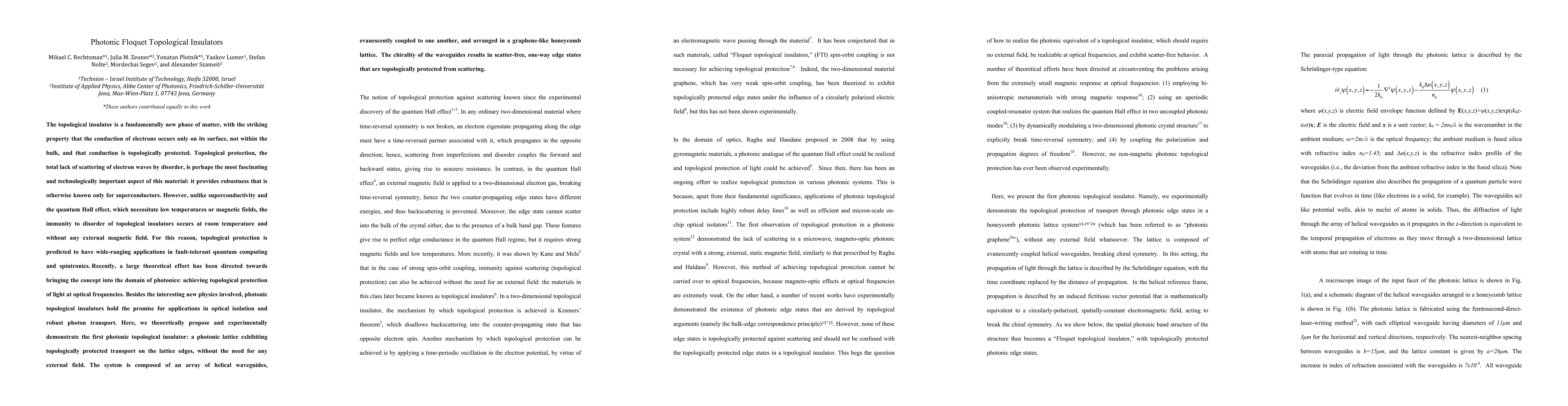 This research paper proposes and experimentally demonstrates the first photonic topological insulator, showcasing topologically protected transport on the edges of a photonic lattice without external fields. The system uses an array of helical waveguides in a graphene-like honeycomb lattice to achieve scatter-free, one-way edge states, promising applications in optical isolation and robust photon transport.