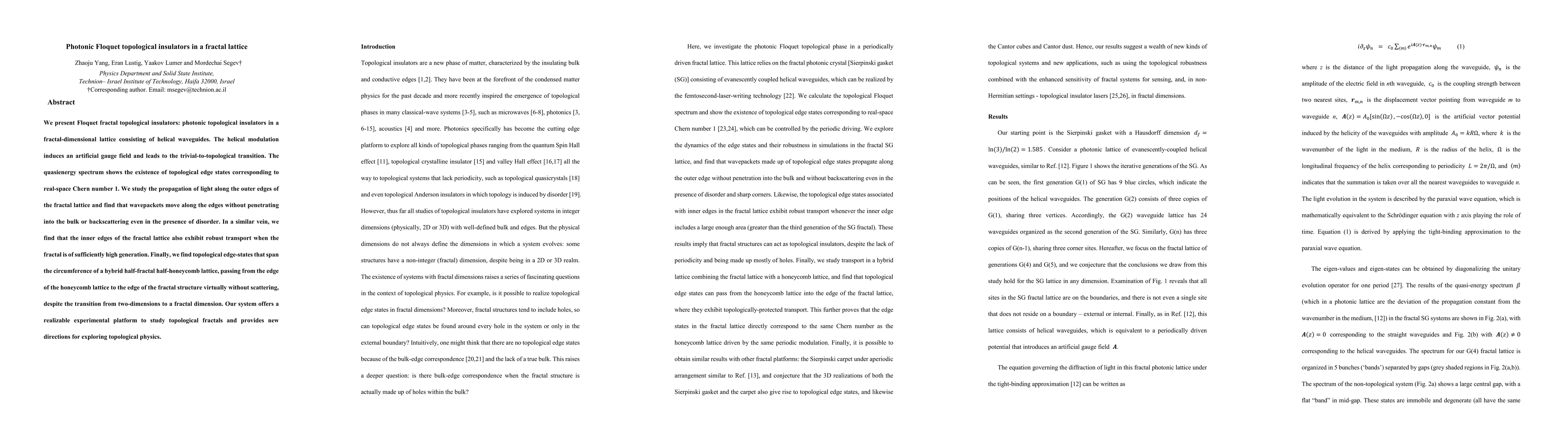 This paper introduces photonic Floquet topological insulators in fractal lattices, demonstrating the emergence of topological edge states and robust transport without scattering, even in disordered systems, and suggests a practical experimental platform for studying topological physics.