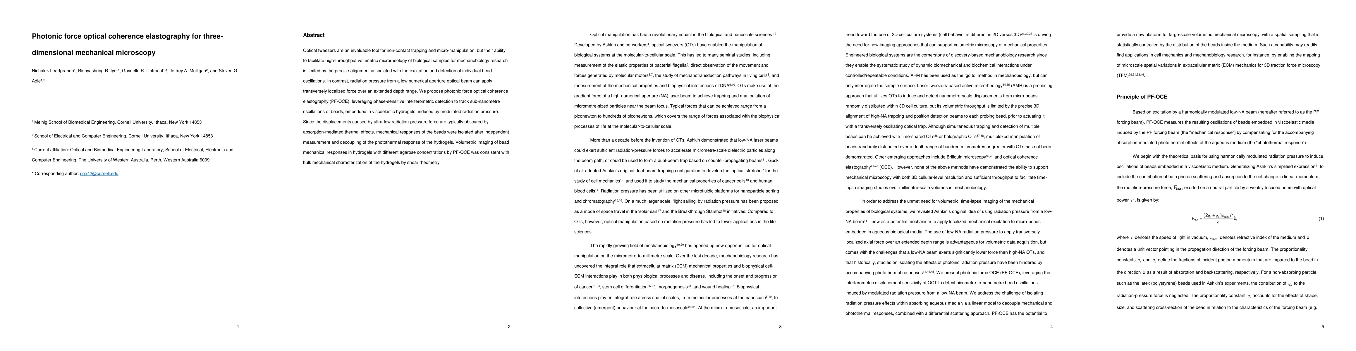 The paper introduces photonic force optical coherence elastography (PF-OCE) for high-throughput volumetric microrheology, using phase-sensitive interferometry to track bead oscillations in hydrogels, overcoming limitations of optical tweezers. PF-OCE successfully isolates mechanical responses from thermal effects, matching hydrogel mechanical properties with shear rheometry results.
