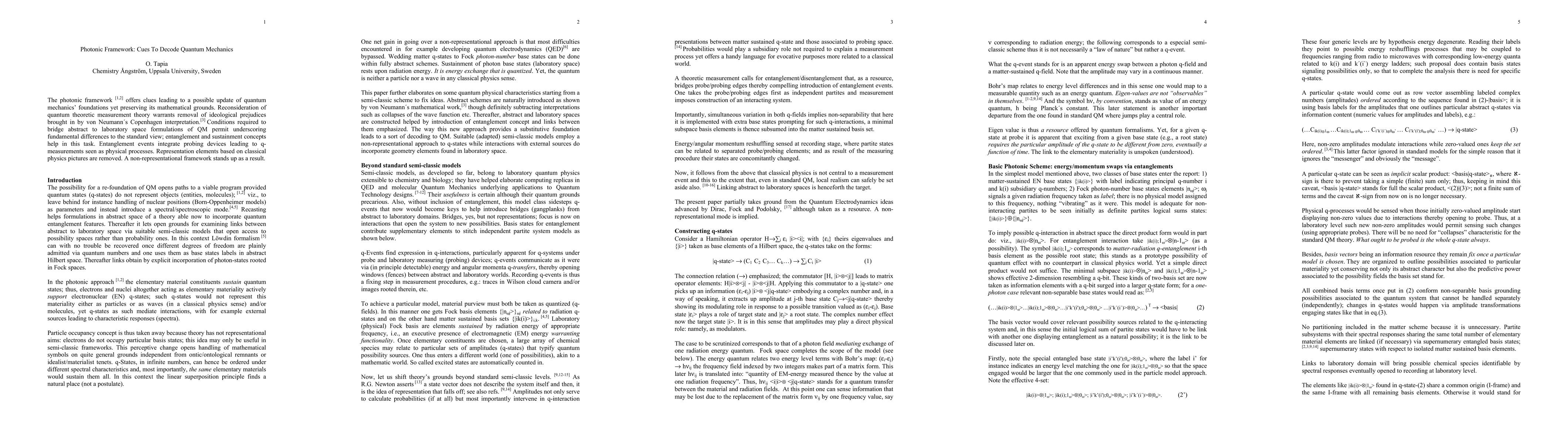 The photonic framework offers clues leading to a possible update of the foundations of quantum mechanics yet preserving its mathematical grounds. Reconsideration of quantum theoretic measurement theory warrants removal of ideological prejudices brought in by von Neumann Copenhagen interpretation. Conditions required to bridge abstract to laboratory space formulations of QM permit underscoring fundamental differences to the standard view; entanglement and sustainment concepts help in this task. Entanglement events integrate probing devices leading to q-measurements seen as physical processes. Representation elements based on classical physics pictures are removed. A non-representational framework stands up as a result.