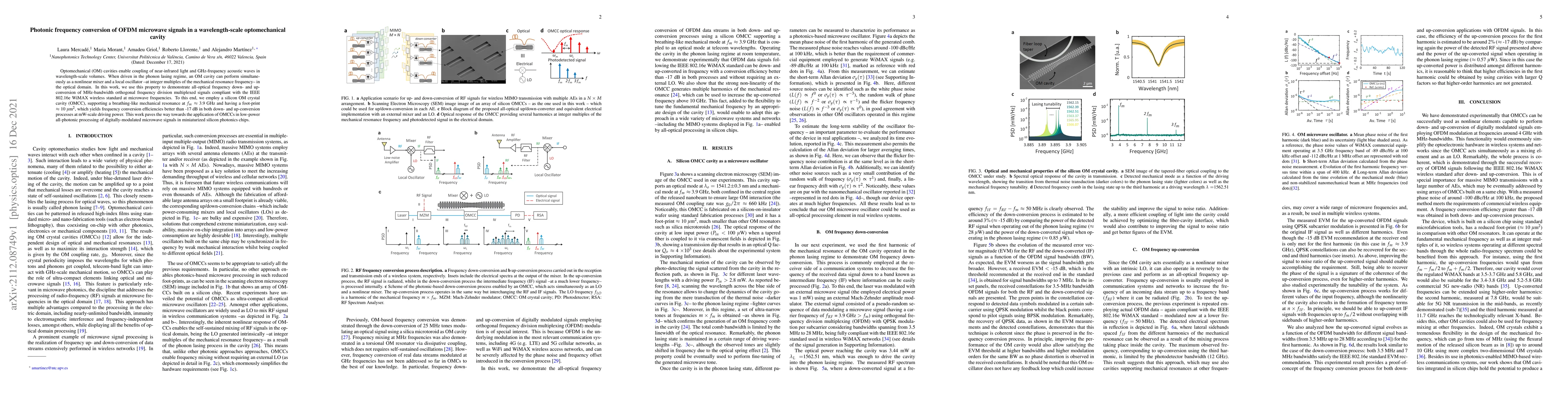 This paper demonstrates all-optical frequency conversion of OFDM microwave signals using a wavelength-scale optomechanical cavity, achieving high efficiency down- and up-conversion at mW-scale power, paving the way for low-power, all-photonic signal processing in silicon photonics.