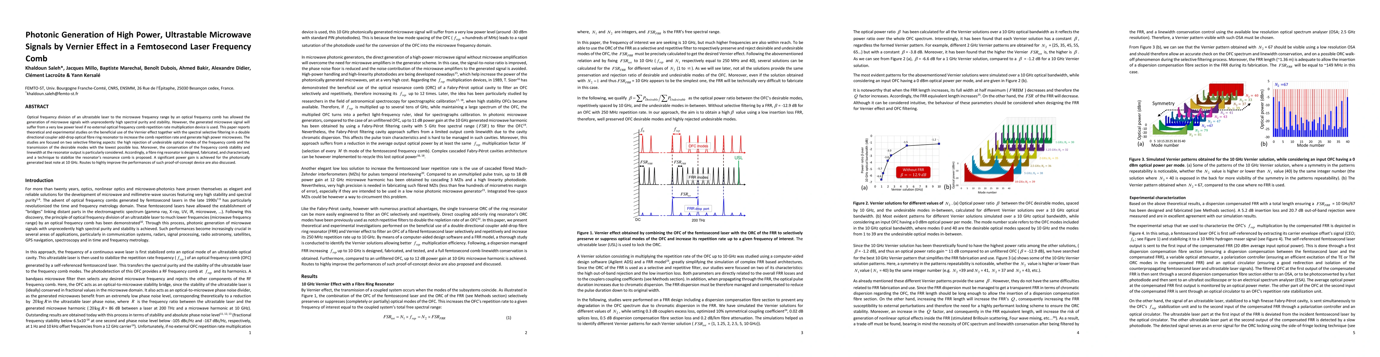 This paper explores the use of the Vernier effect and spectral selective filtering in a double directional coupler to enhance the power of microwave signals generated from an ultrastable laser frequency comb, achieving high power while maintaining spectral purity and stability. The study designs and characterizes a fiber ring resonator, demonstrating a significant power gain for a 10 GHz beat note.