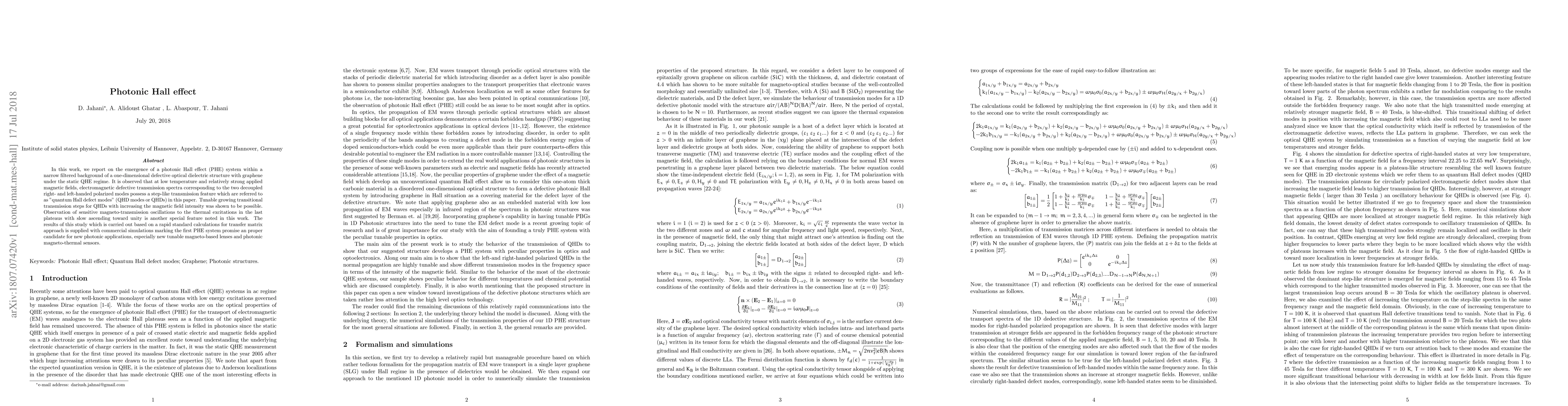 This paper reports on the emergence of a photonic Hall effect in a one-dimensional defective optical dielectric structure with graphene under the quantum Hall effect regime, showing step-like transmission features in electromagnetic modes. The study suggests potential for new tunable photonic applications, including magneto-based lenses and sensors.
