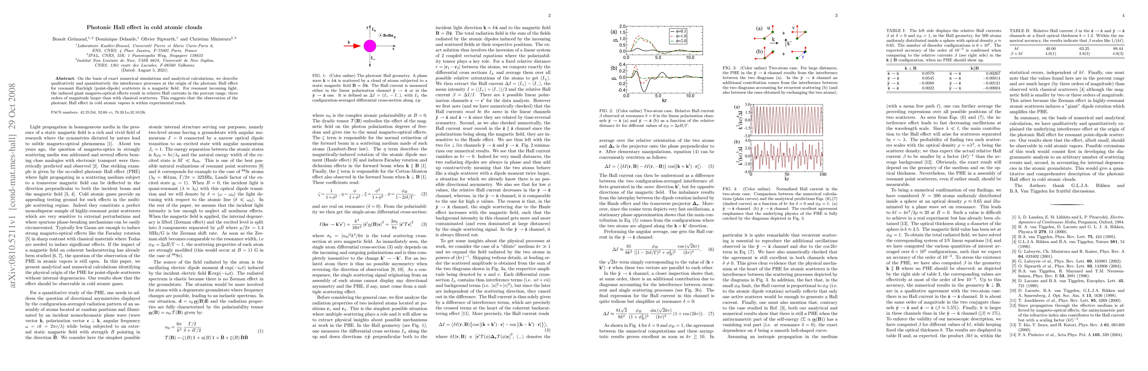 The research paper investigates the photonic Hall effect in cold atomic clouds, revealing significant magneto-optical effects and giant Hall currents in resonant Rayleigh scatterers under magnetic fields, suggesting feasible experimental observation.