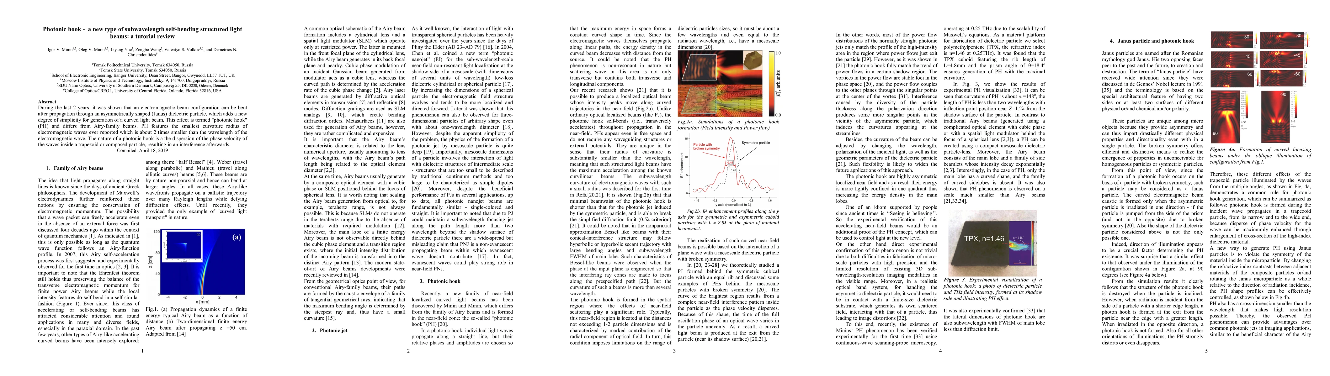 During the last 2 years, it was shown that an electromagnetic beam configuration can be bent after propagation through an asymmetrically shaped (Janus) dielectric particle, which adds a new degree of simplicity for generation of a curved light beam. This effect is termed "photonic hook" (PH) and differs from Airy-family beams. PH features the smallest curvature radius of electromagnetic waves ever reported which is about 2 times smaller than the wavelength of the electromagnetic wave. The nature of a photonic hook is a the dispersion of the phase velocity of the waves inside a trapezoid or composed particle, resulting in an interference afterwards.