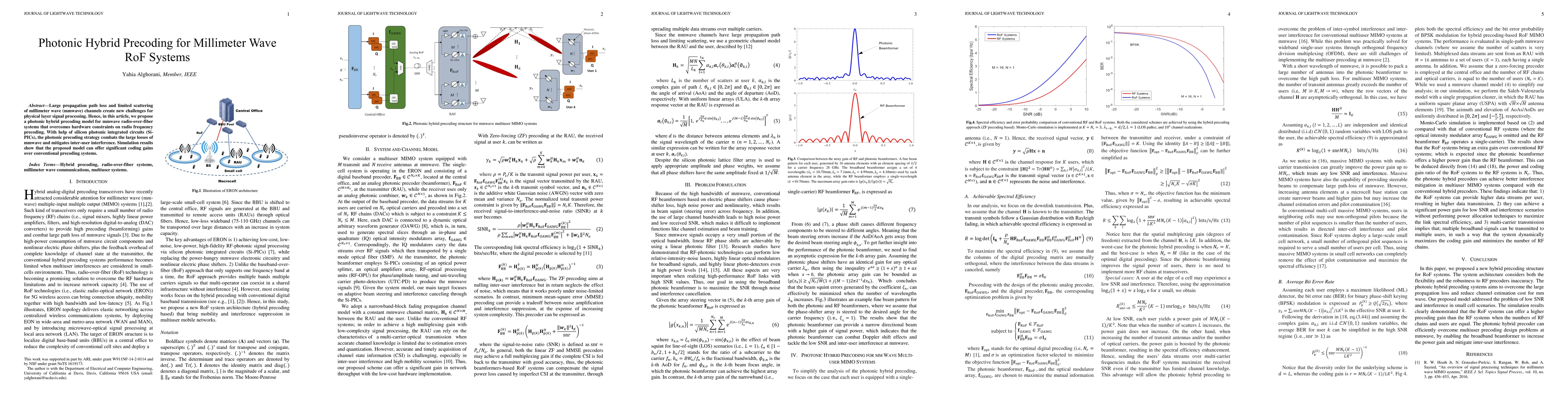 This paper proposes a photonic hybrid precoding model for millimeter wave radio-over-fiber systems to address hardware constraints and mitigate large propagation losses. Utilizing silicon photonic integrated circuits, the approach demonstrates significant coding gains and reduced inter-user interference compared to conventional precoding methods.