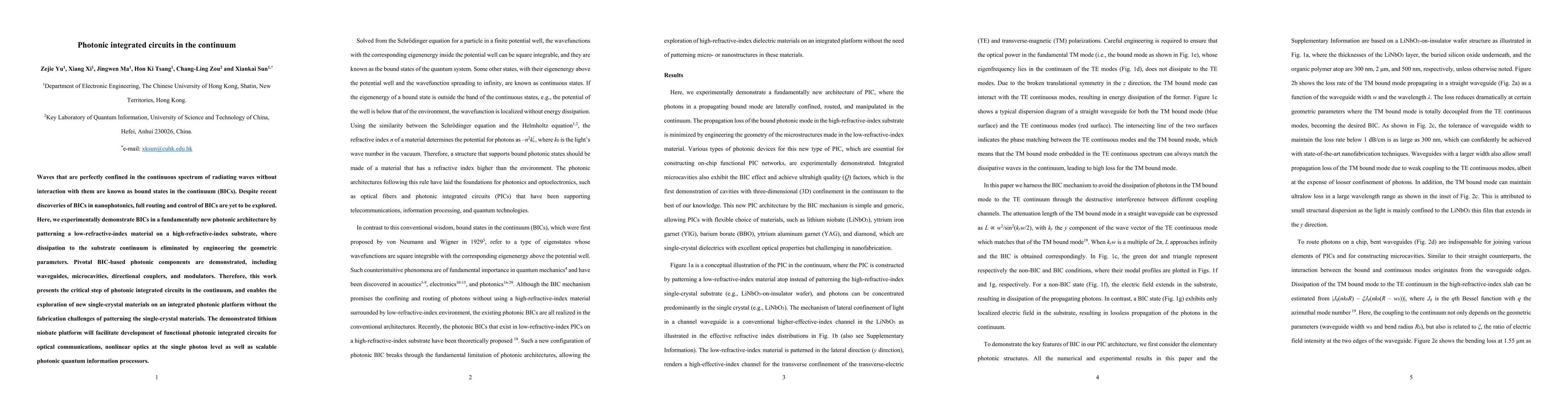 This paper demonstrates bound states in the continuum (BICs) in a novel photonic architecture, eliminating dissipation to the substrate continuum through geometric engineering. It showcases BIC-based photonic components like waveguides and modulators, paving the way for new single-crystal materials integration in photonic circuits, with potential applications in optical communications, nonlinear optics, and quantum information processing.