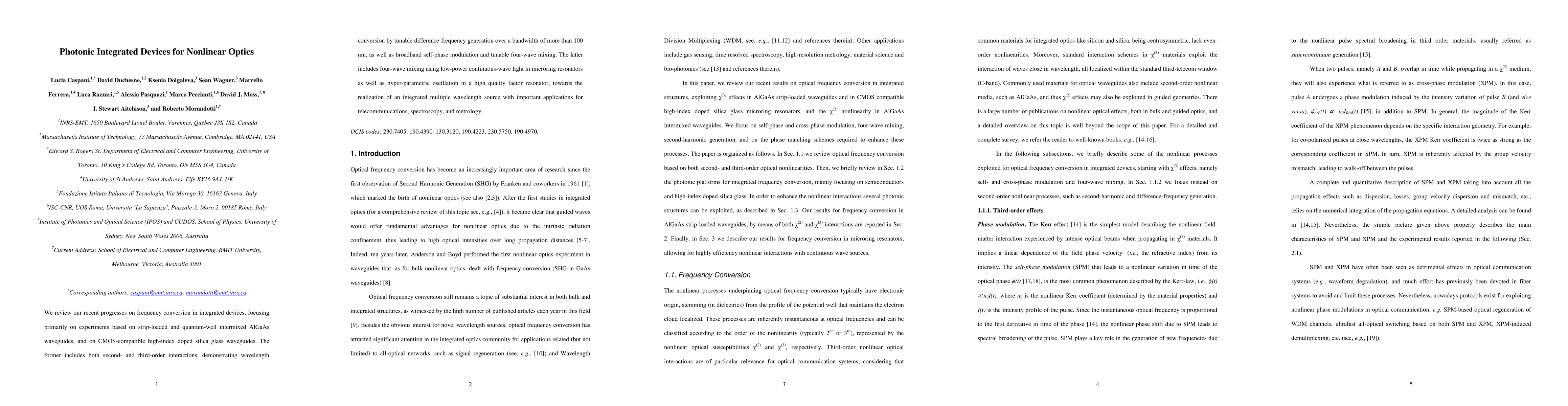 This paper reviews advancements in photonic integrated devices for nonlinear optics, highlighting frequency conversion experiments in AlGaAs waveguides and CMOS-compatible high-index silica glass waveguides. It demonstrates tunable difference-frequency generation, broadband self-phase modulation, and four-wave mixing, with applications in telecommunications, spectroscopy, and metrology.
