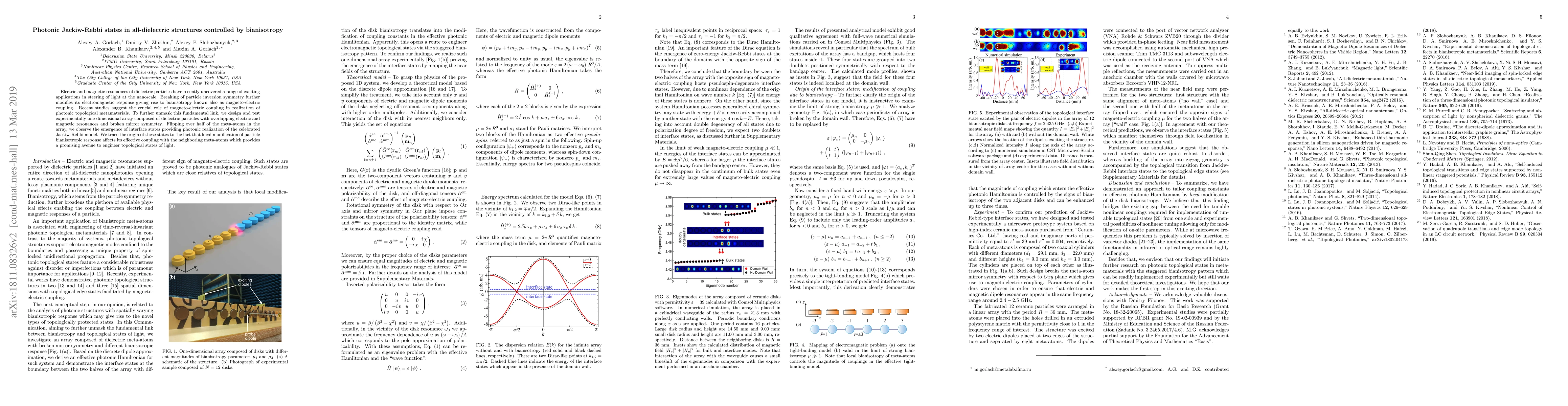 Electric and magnetic resonances of dielectric particles have recently uncovered a range of exciting applications in steering of light at the nanoscale. Breaking of particle inversion symmetry further modifies its electromagnetic response giving rise to bianisotropy known also as magneto-electric coupling. Recent studies suggest the crucial role of magneto-electric coupling in realization of photonic topological metamaterials. To further unmask this fundamental link, we design and test experimentally one-dimensional array composed of dielectric particles with overlapping electric and magnetic resonances and broken mirror symmetry. Flipping over half of the meta-atoms in the array, we observe the emergence of interface states providing photonic realization of the celebrated Jackiw-Rebbi model. We trace the origin of these states to the fact that local modification of particle bianisotropic response affects its effective coupling with the neighboring meta-atoms which provides a promising avenue to engineer topological states of light.
