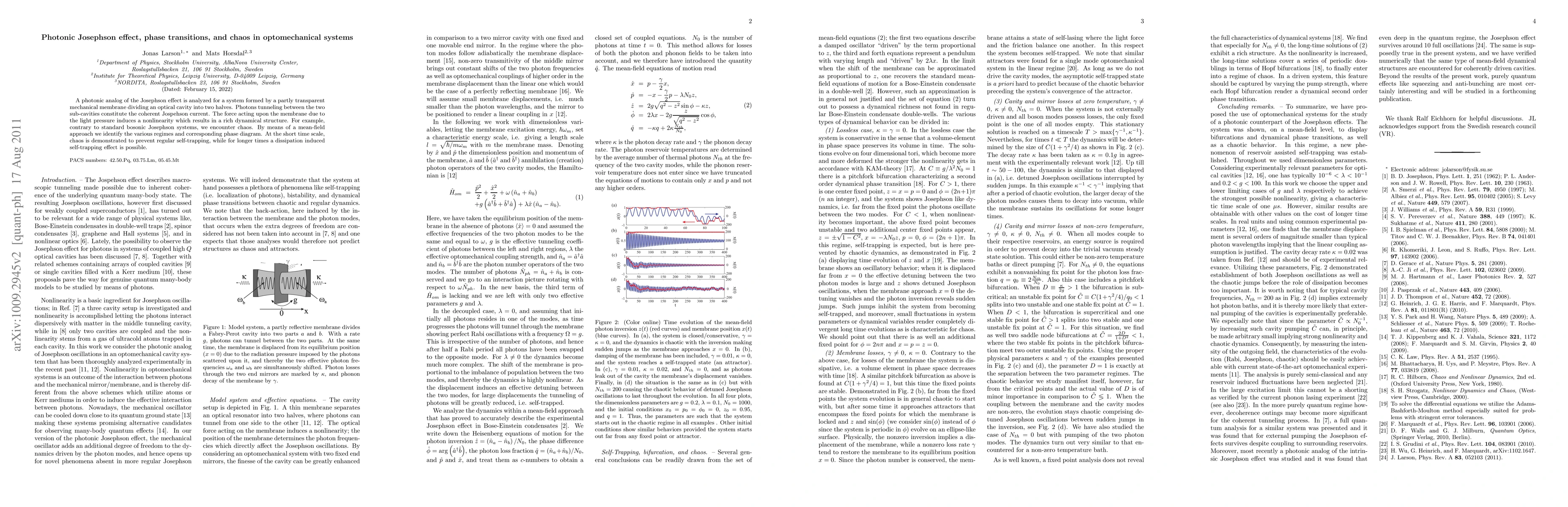 Researchers analyze a system where photons tunnel between two optical cavities separated by a mechanical membrane, leading to chaotic behavior in the Josephson effect, and discover how this affects regular self-trapping over time.