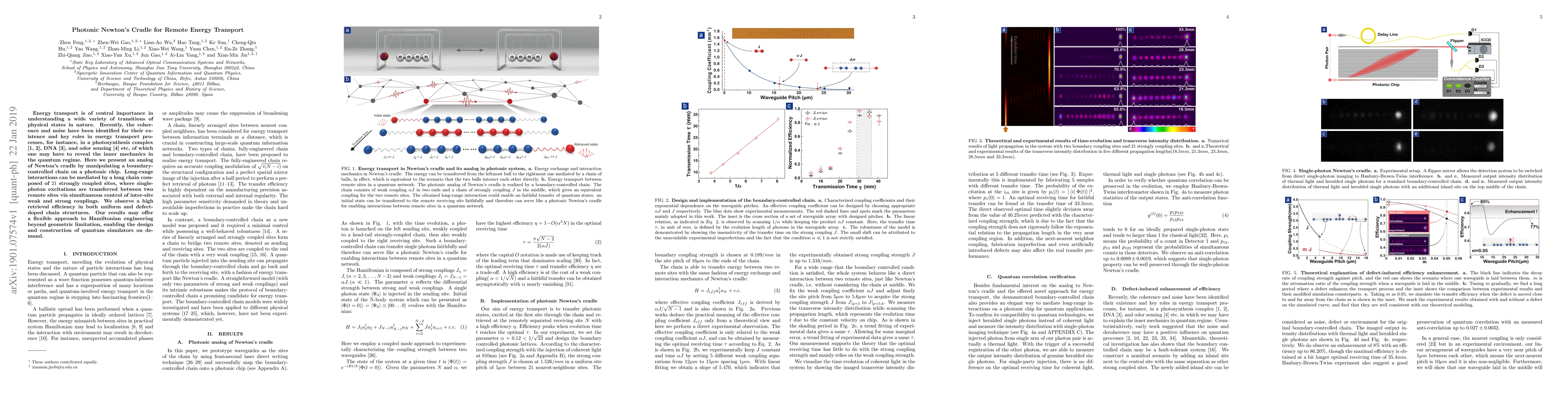 Energy transport is of central importance in understanding a wide variety of transitions of physical states in nature. Recently, the coherence and noise have been identified for their existence and key roles in energy transport processes, for instance, in a photosynthesis complex, DNA, and odor sensing etc, of which one may have to reveal the inner mechanics in the quantum regime. Here we present an analog of Newton's cradle by manipulating a boundary-controlled chain on a photonic chip. Long-range interactions can be mediated by a long chain composed of 21 strongly coupled sites, where single-photon excitations are transferred between two remote sites via simultaneous control of inter-site weak and strong couplings. We observe a high retrieval efficiency in both uniform and defect-doped chain structures. Our results may offer a flexible approach to Hamiltonian engineering beyond geometric limitation, enabling the design and construction of quantum simulators on demand.