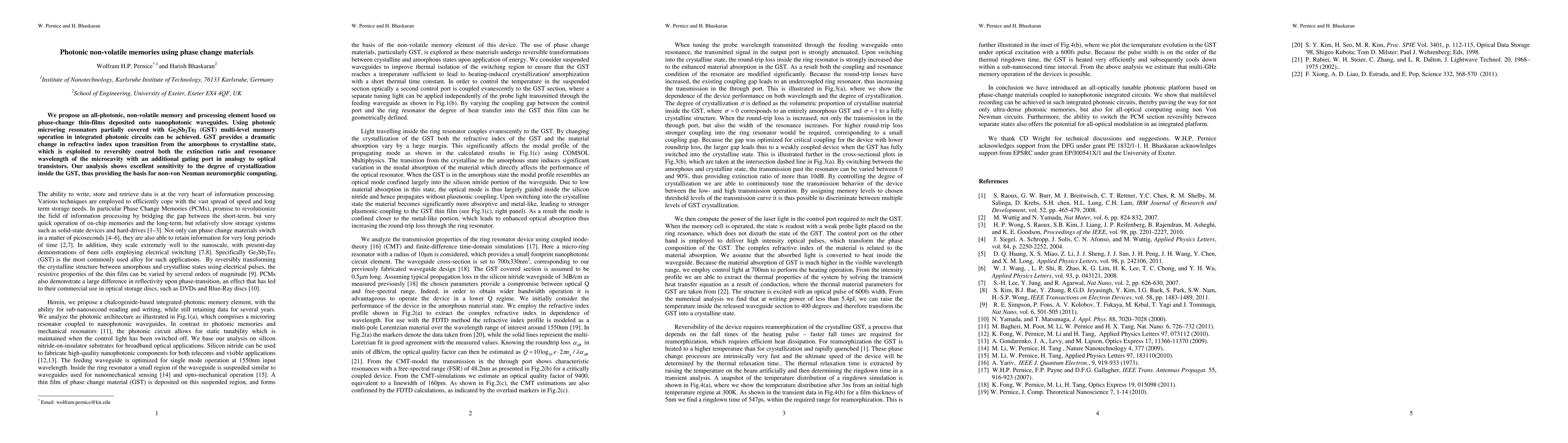 This paper proposes an all-photonic, non-volatile memory system utilizing phase-change materials on nanophotonic waveguides. By leveraging the refractive index change in Ge2Sb2Te5 (GST) between amorphous and crystalline states, the system can control microring resonators for multi-level memory operations, enabling potential applications in neuromorphic computing.