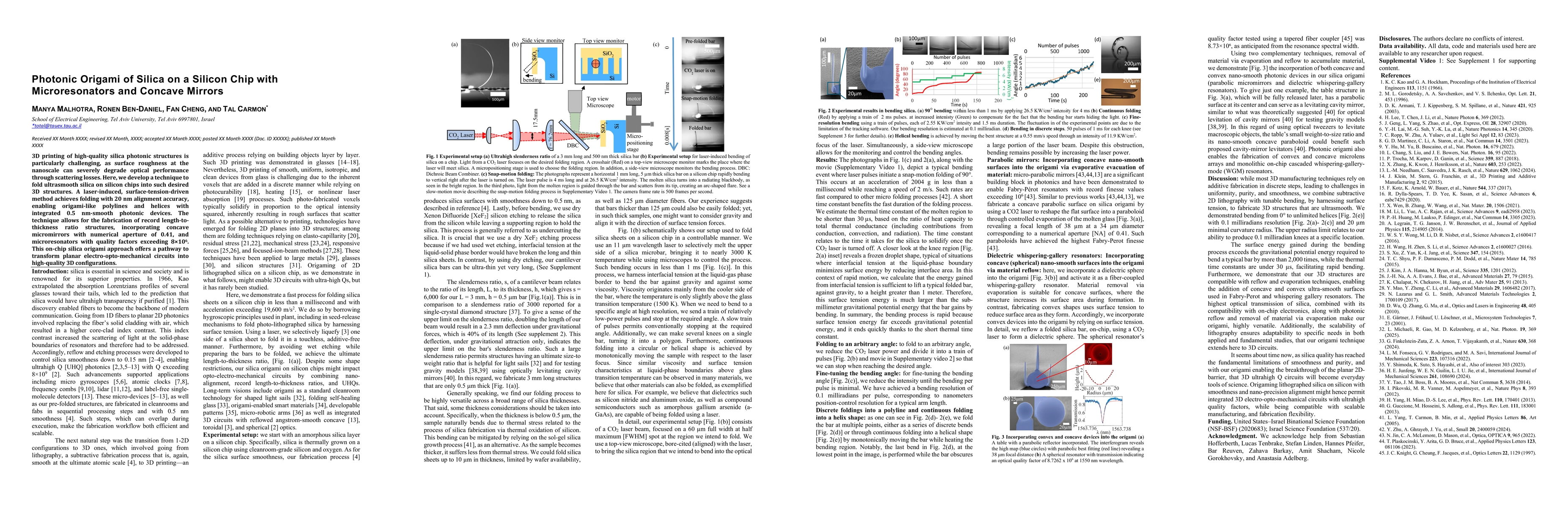 3D printing of high-quality silica photonic structures is particularly challenging, as surface roughness at the nanoscale can severely degrade optical performance through scattering losses. Here, we develop a technique to fold ultrasmooth silica on silicon chips into such desired 3D structures. A laser-induced, surface-tension-driven method achieves folding with 20 nm alignment accuracy, enabling origami-like polylines and helices with integrated 0.5 nm-smooth photonic devices. The technique allows for the fabrication of record length-to-thickness ratio structures, incorporating concave micromirrors with numerical aperture of 0.41, and microresonators with quality factors exceeding ${8 \times 10^6}$. This on-chip silica origami approach offers a pathway to transform planar electro-opto-mechanical circuits into high-quality 3D configurations.