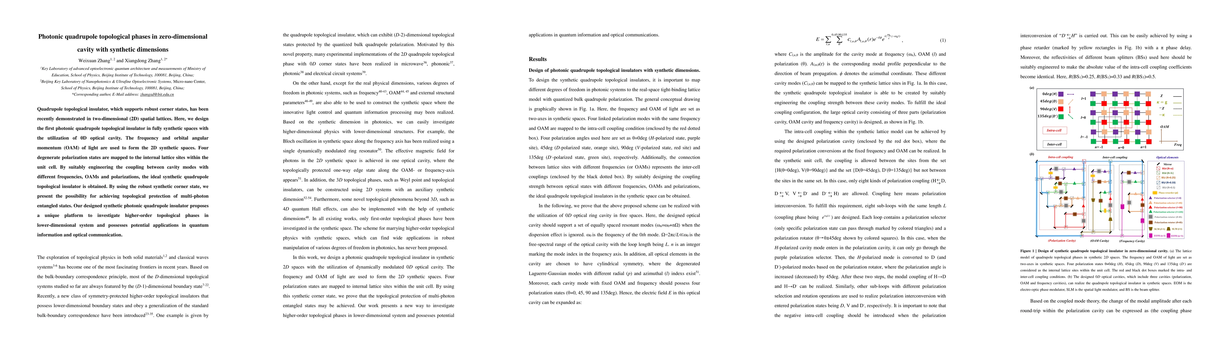This research introduces the first photonic quadrupole topological insulator in fully synthetic spaces, utilizing a 0D optical cavity and offering a unique platform for investigating higher-order topological phases in 0D systems.