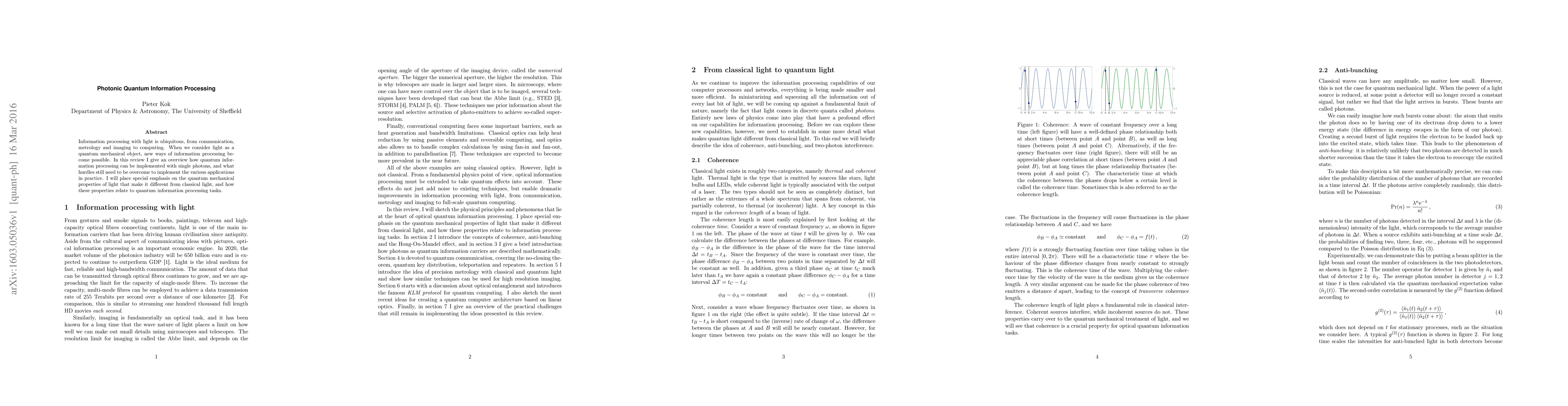 This review explores the potential of photonic quantum information processing using single photons, highlighting the unique quantum mechanical properties that differentiate light from classical signals and the challenges that remain for practical implementation of quantum applications.