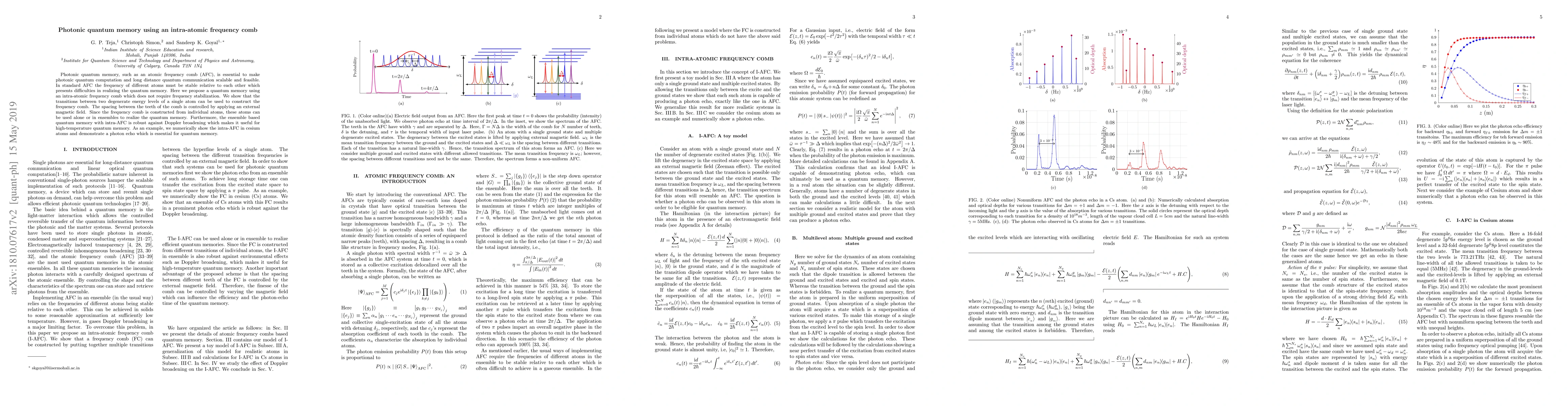 This paper proposes a photonic quantum memory using an intra-atomic frequency comb that eliminates the need for inter-atomic frequency stabilization. The memory utilizes transitions between degenerate energy levels within single atoms, controlled by external magnetic fields, and is shown to be robust against Doppler broadening, making it suitable for high-temperature quantum communication.